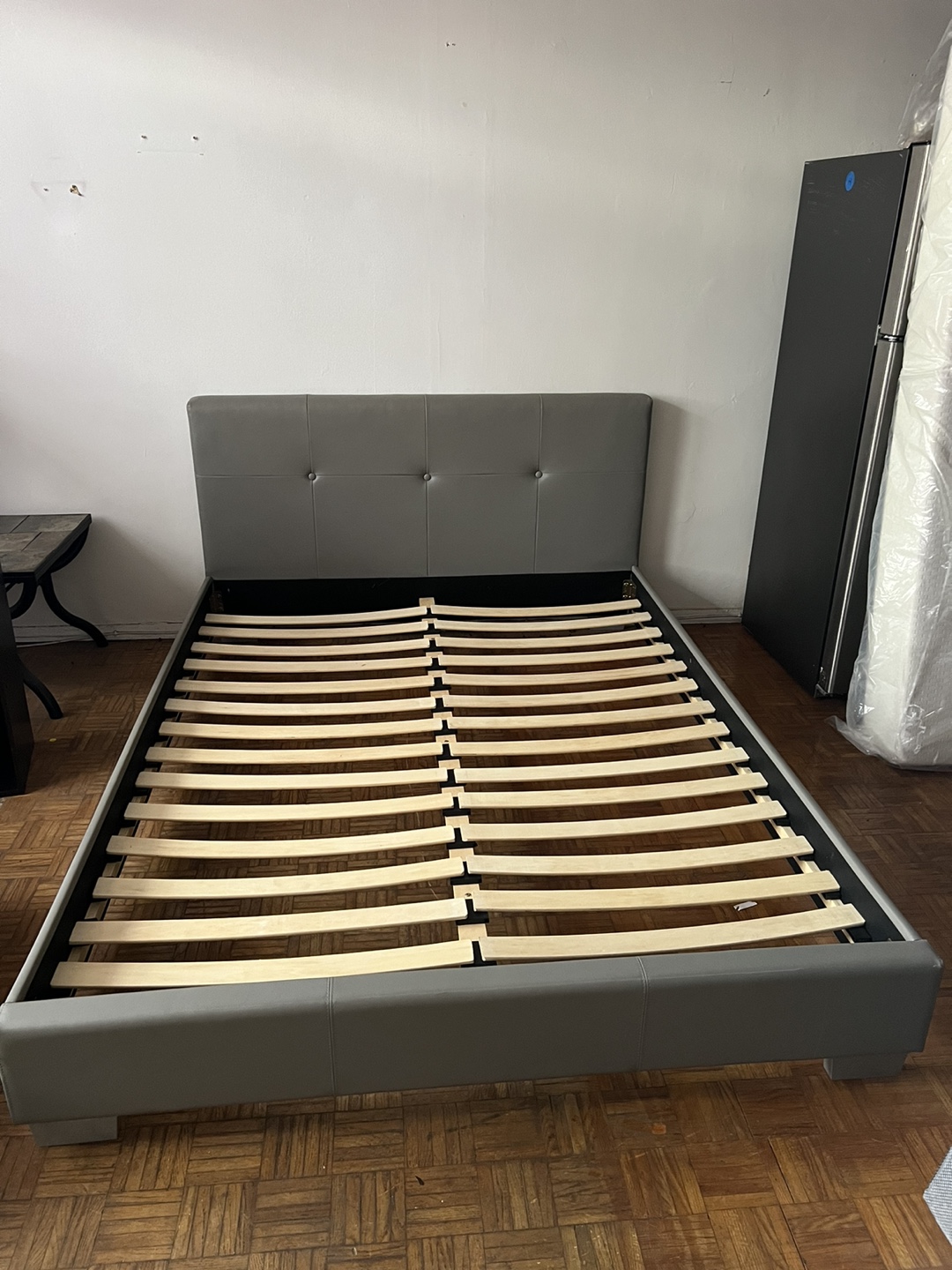 Queen size bed frame with slatted support. Gray faux leather headboard. No mattress included.