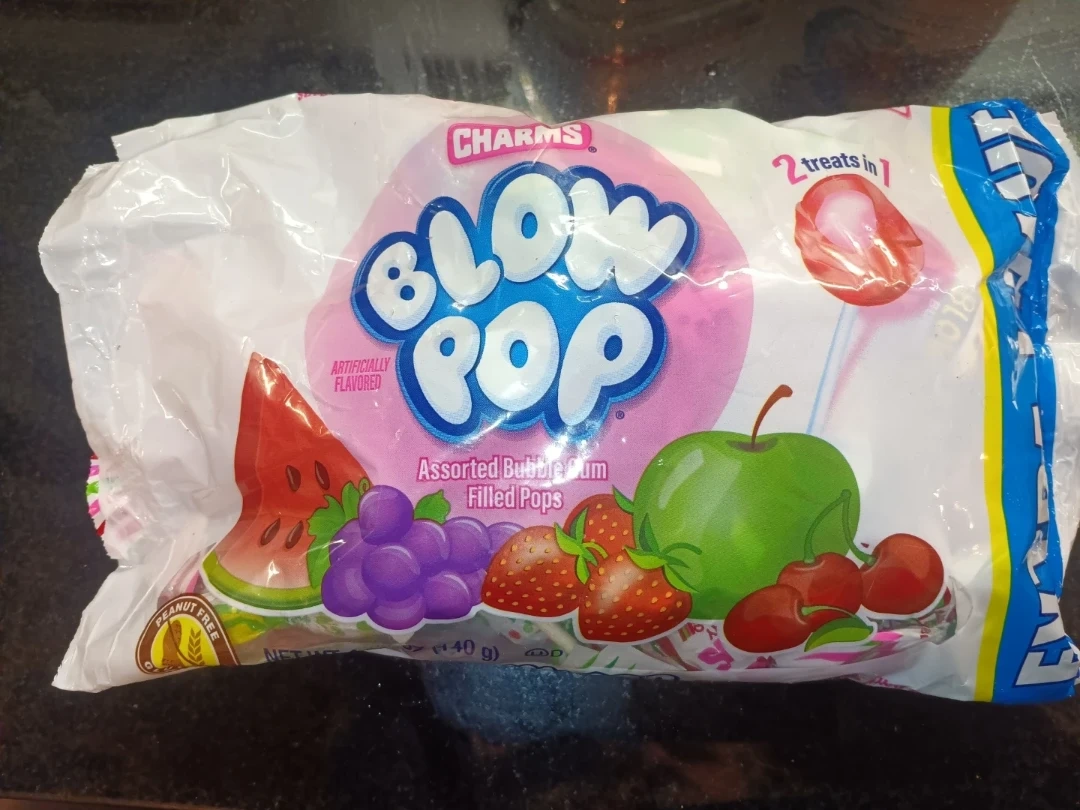 This bag contains Charms Assorted Bubble Gum Filled Pops. They're artificially flavored and peanut-free. Each pop contains 2 treats in 1.