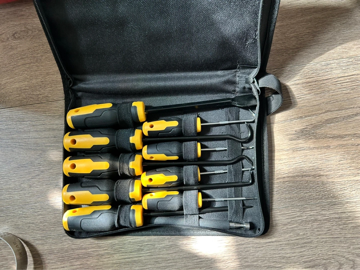 This set includes eight essential screwdrivers and picks, perfect for detailed work. It comes with a durable black carrying case. The tools have black and yellow handles for a good grip.