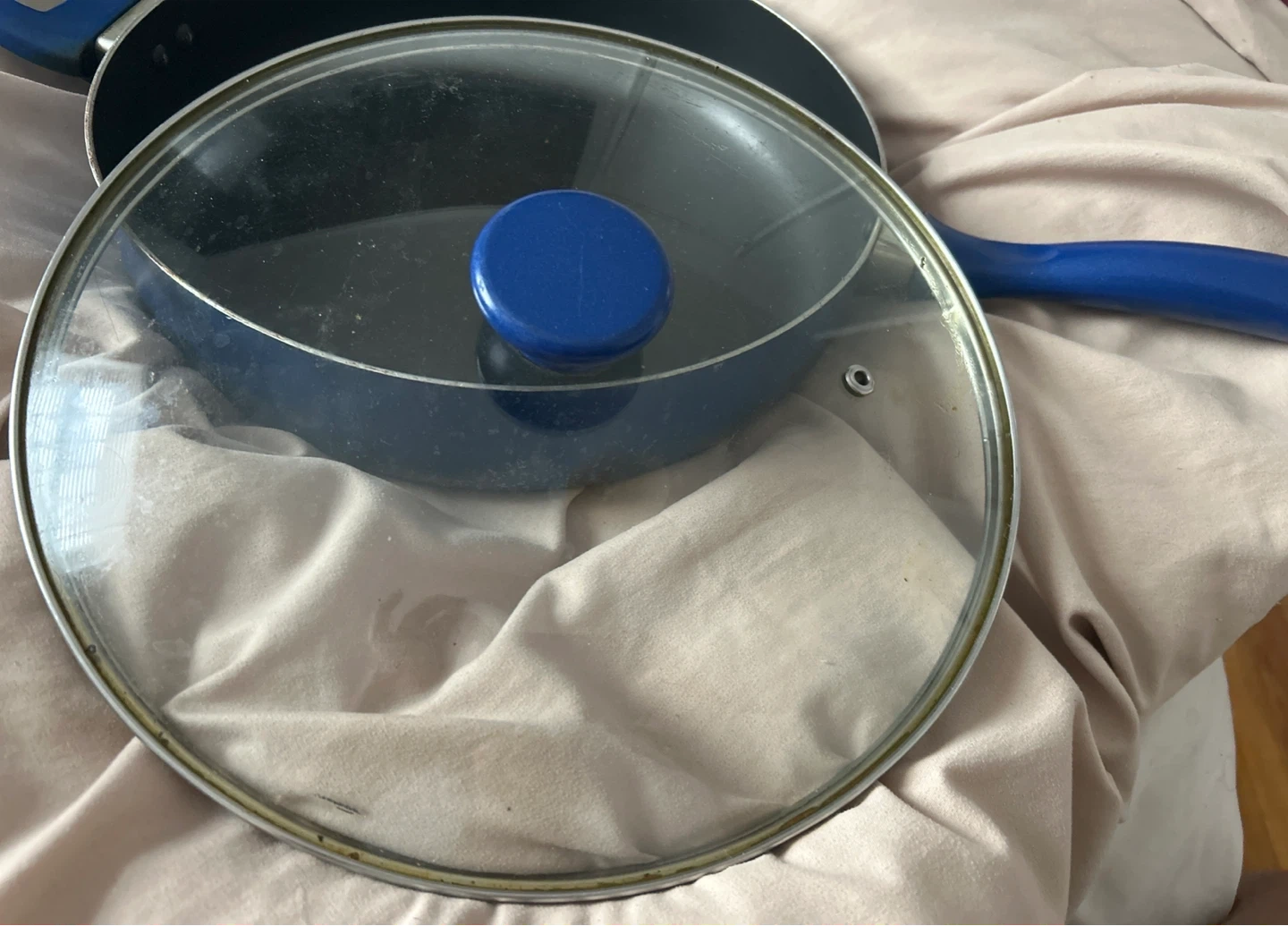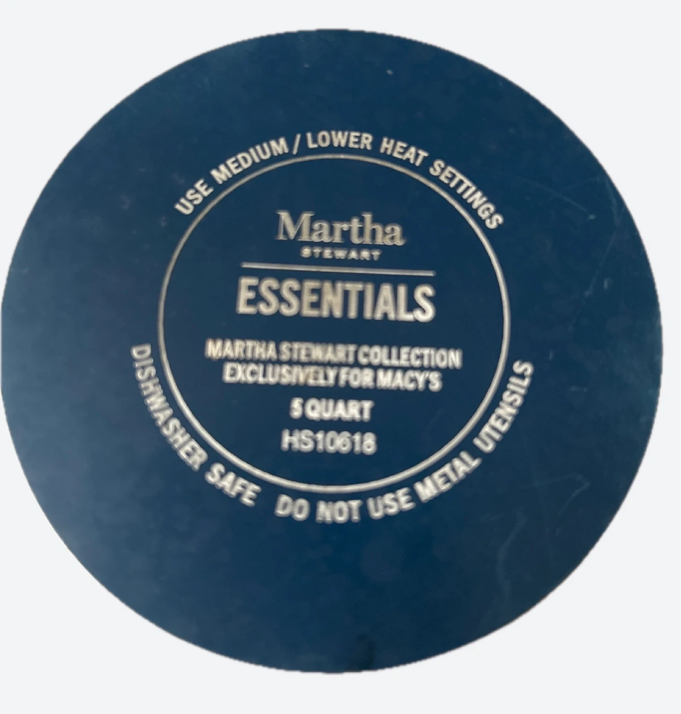 Martha Stewart Essentials sauté pan. 5 quart capacity. Blue exterior with black interior. Includes glass lid with blue handle. Dishwasher safe.
