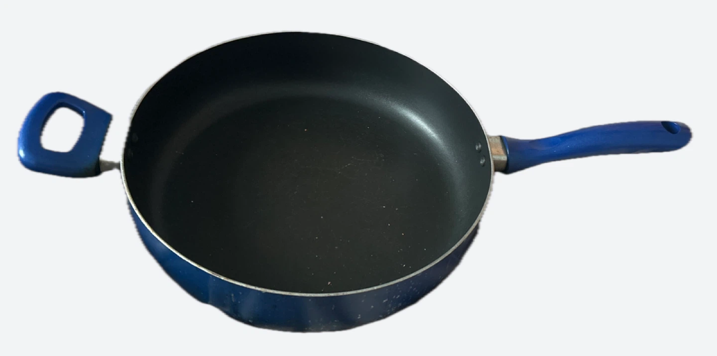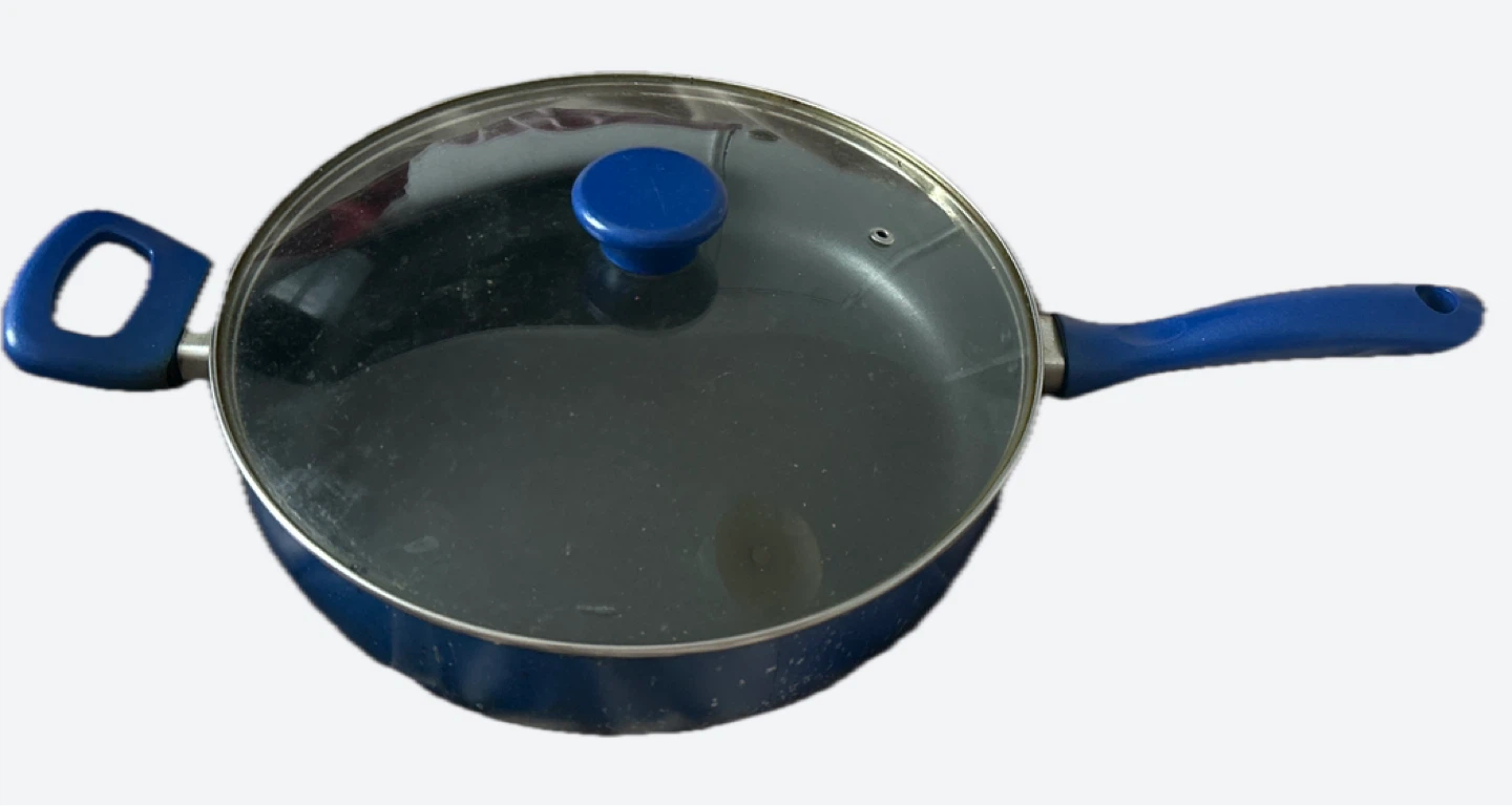 Martha Stewart Essentials sauté pan. 5 quart capacity. Blue exterior with black interior. Includes glass lid with blue handle. Dishwasher safe.