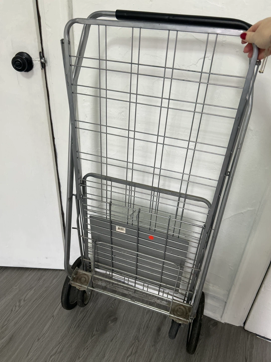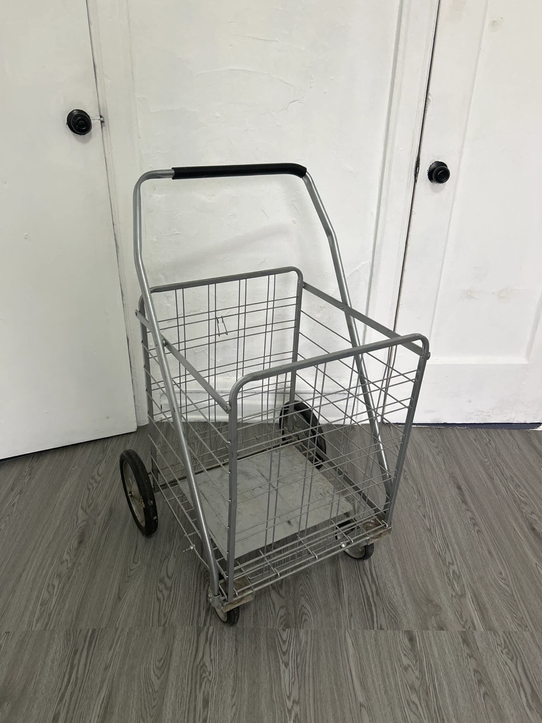 This is a durable metal folding shopping cart. It's great for carrying groceries or laundry. The cart features a sturdy wire basket and easy-roll wheels.