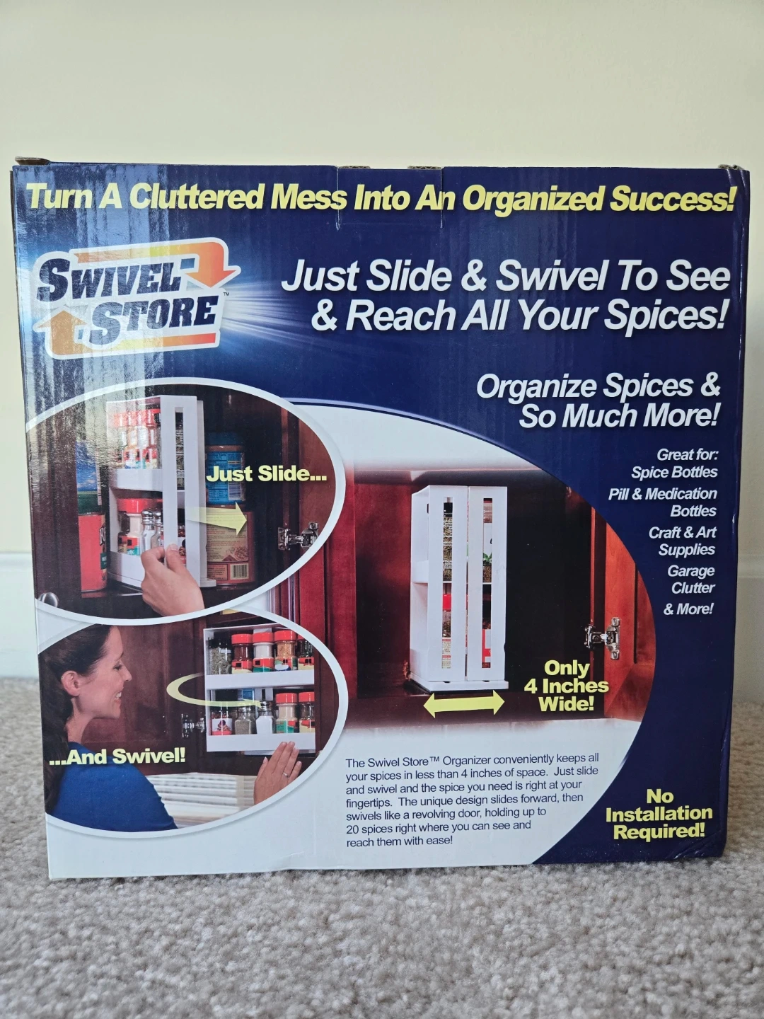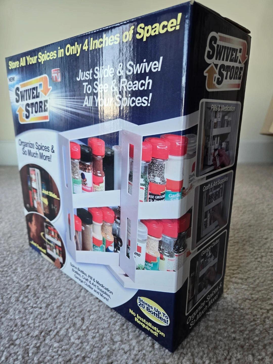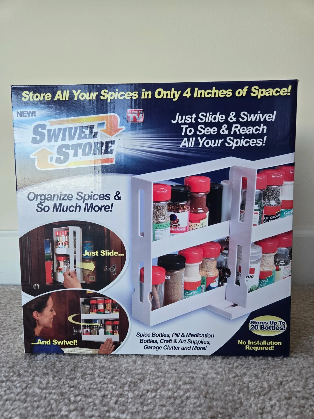 I have a brand new Swivel Store spice rack organizer for sale! It's perfect for organizing spices, pill and medication bottles, craft and art supplies, and even garage clutter. This swivel store can store up to 20 bottles and requires no installation! This item is approximately 11" wide, 11" tall, 4" deep.