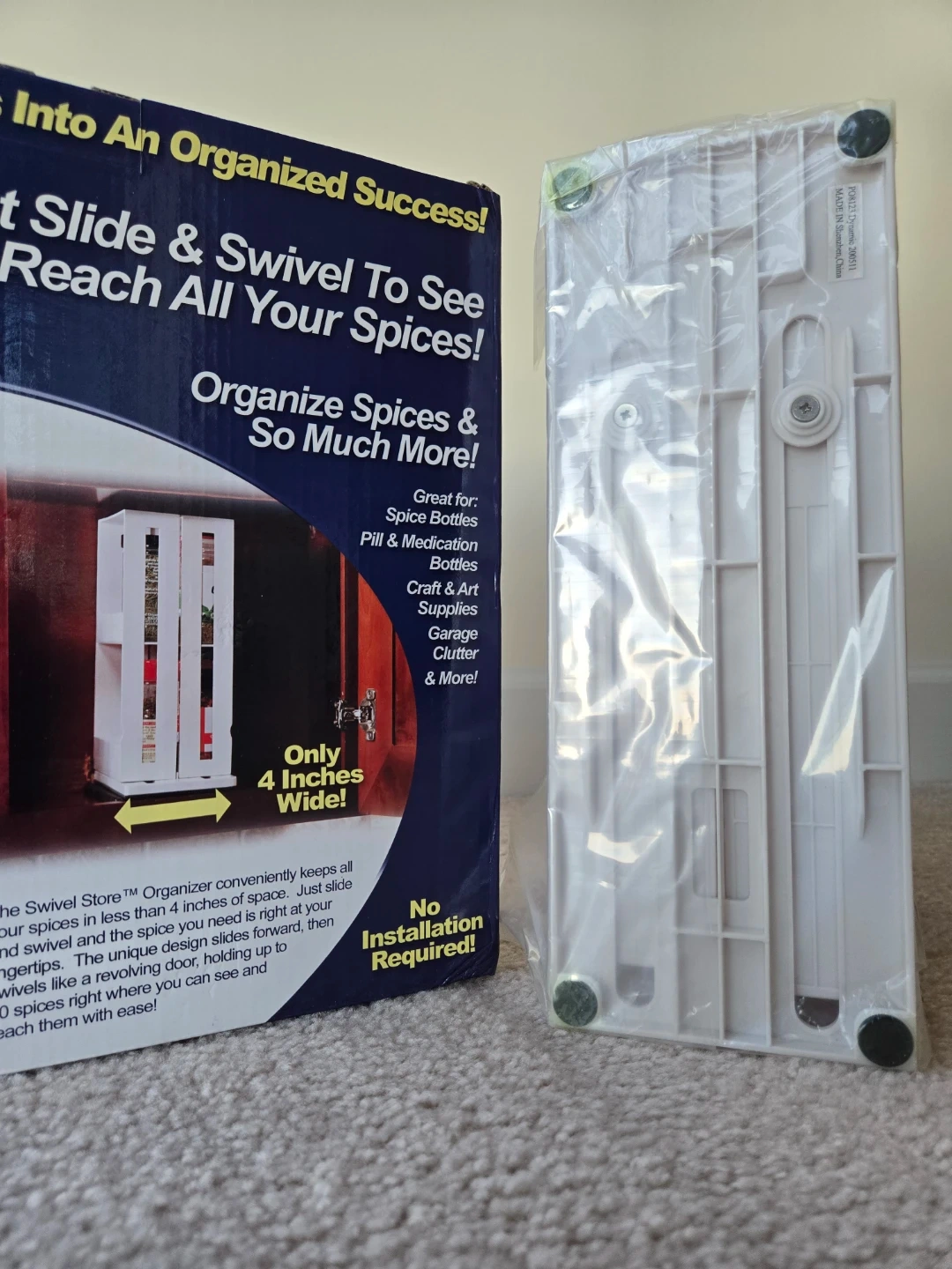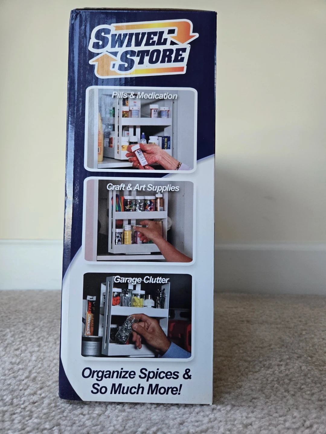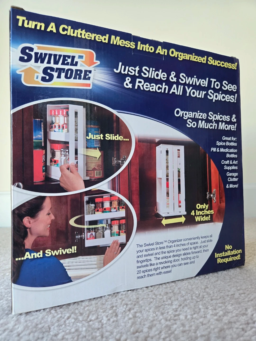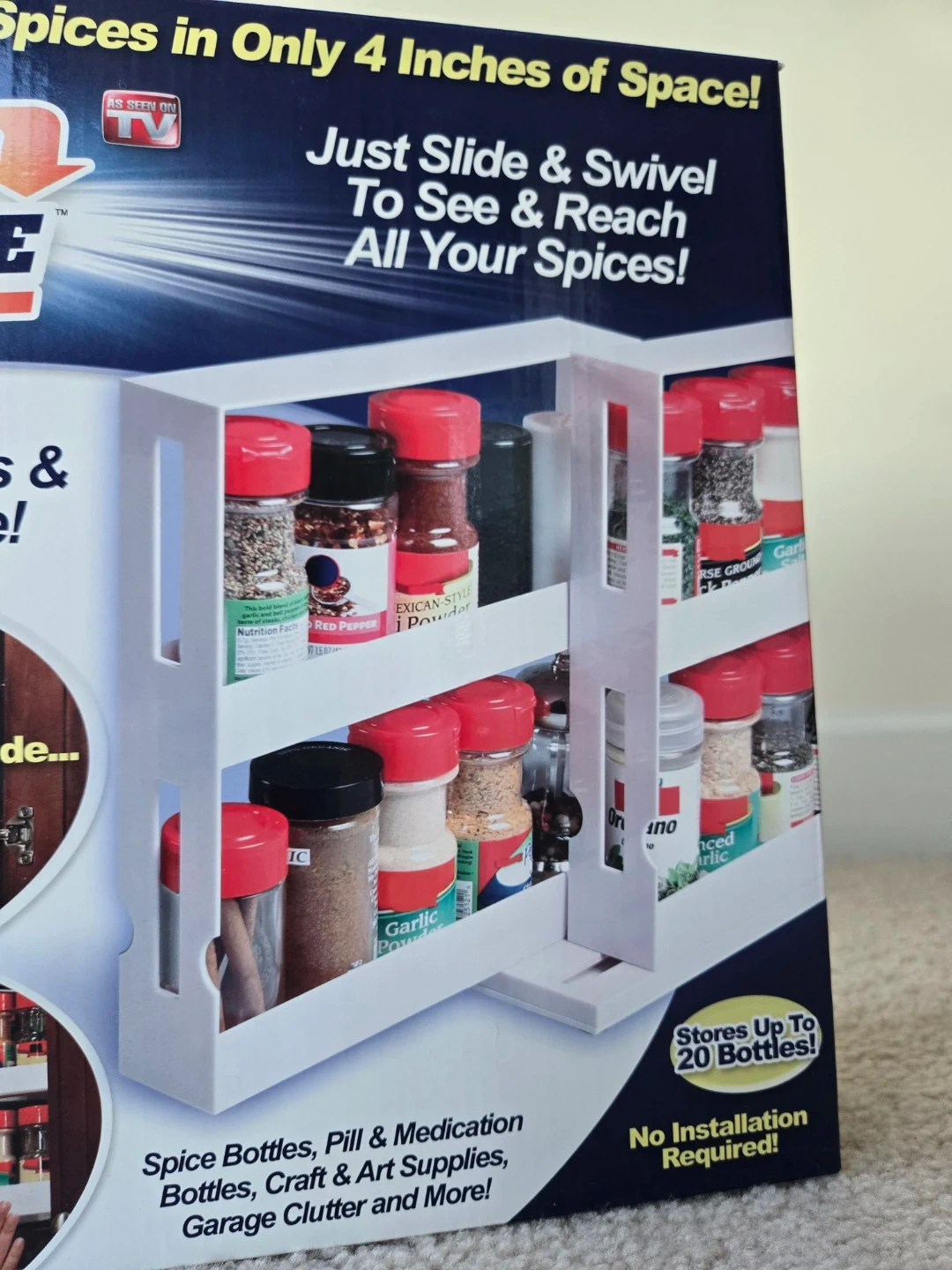 I have a brand new Swivel Store spice rack organizer for sale! It's perfect for organizing spices, pill and medication bottles, craft and art supplies, and even garage clutter. This swivel store can store up to 20 bottles and requires no installation! This item is approximately 11" wide, 11" tall, 4" deep.