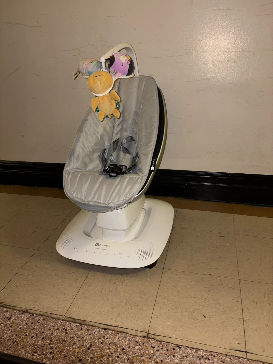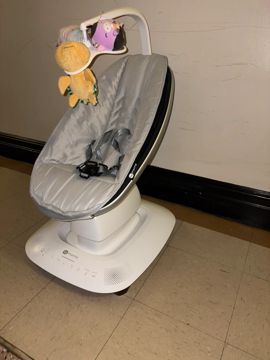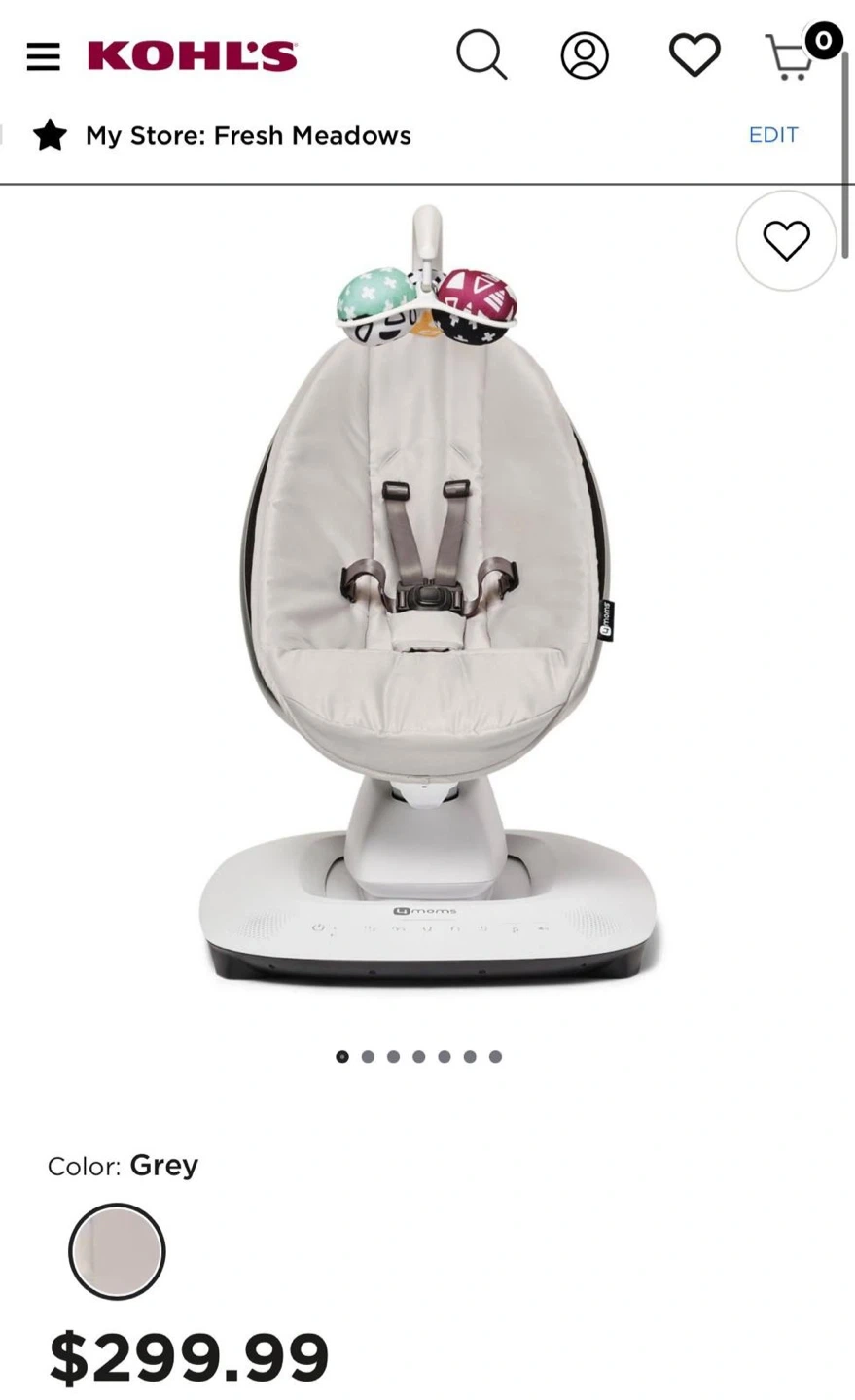 This 4moms MamaRoo 4 infant seat is designed to mimic natural motions. It comes with multiple soothing motions and five speed options. Includes Bluetooth connectivity for playing music. Grey fabric with attached toy bar.