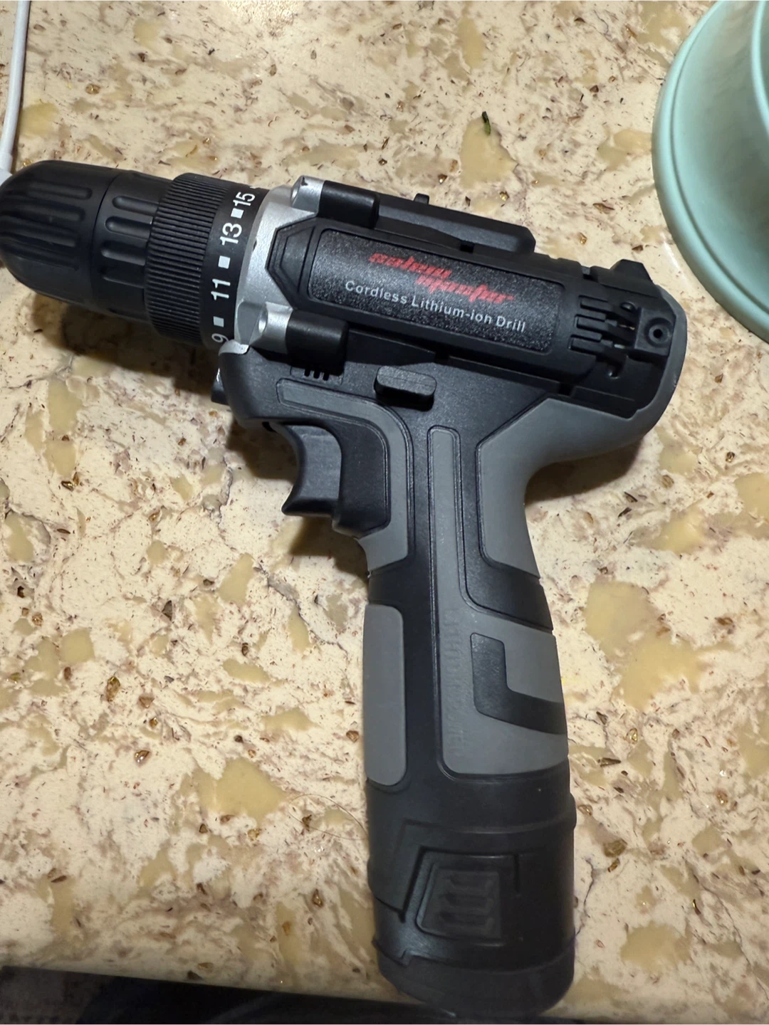 This is a Black & Decker cordless lithium-ion drill. It has a keyless chuck for easy bit changes. The drill has adjustable torque settings. Missing charger