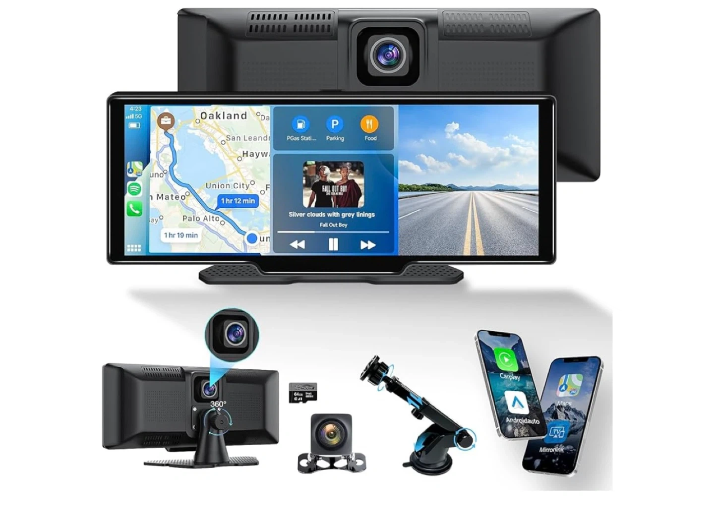 This smart display system connects to your car for navigation and entertainment. It features a 360-degree camera and supports Carplay, Android Auto, and Mirrorlink. Includes GPS, a 64GB SD card, and a suction cup mount.