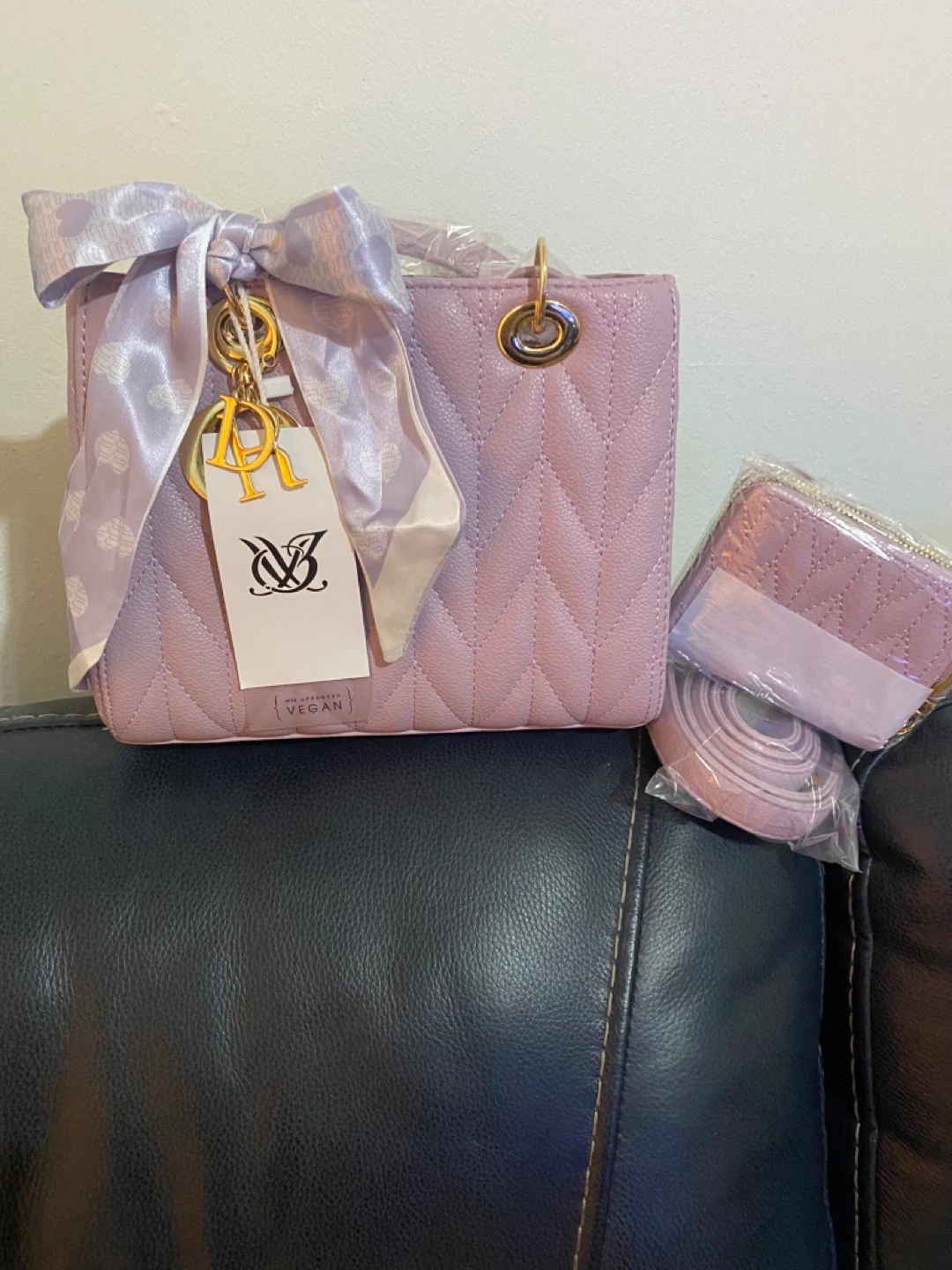 Selling a VR London lilac handbag made with vegan leather. It comes with a matching wallet and strap, still in its original packaging!