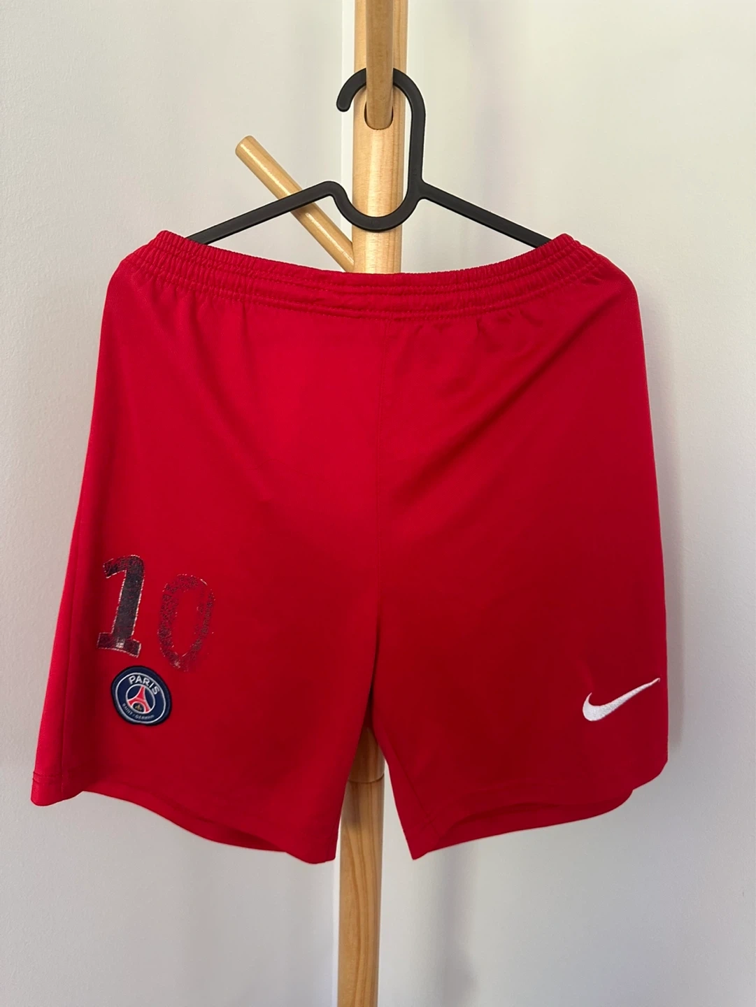 These are red soccer shorts from Paris Saint-Germain. They feature the Nike swoosh logo and the team crest. Includes the number '10' on the left leg. Made from polyester for breathability. Elastic waistband.