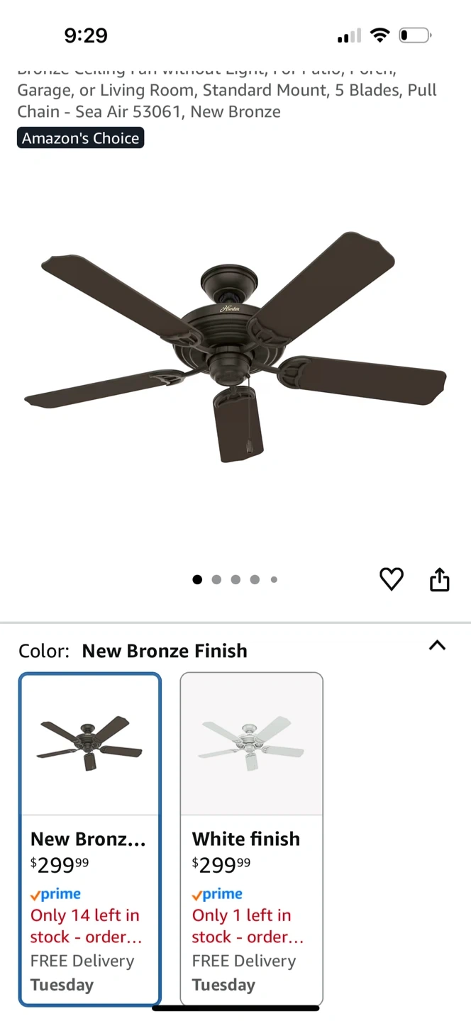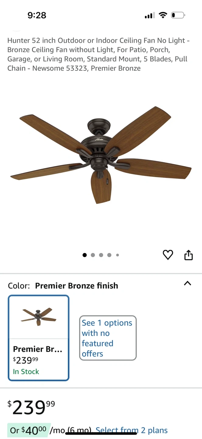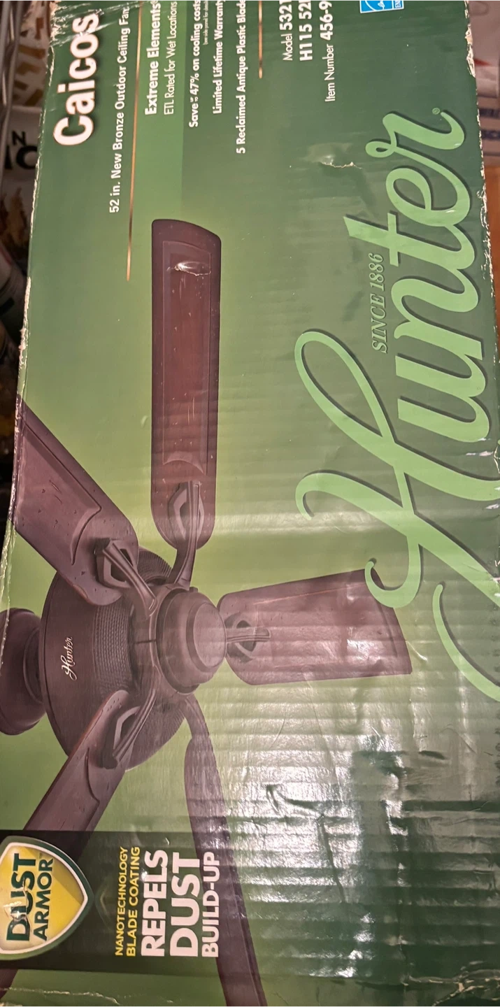 Selling a Hunter Caicos 52-inch ceiling fan in new bronze! This outdoor ceiling fan features extreme elements and is ETL rated for wet locations. It has a 47° on cooling costs and a limited lifetime warranty. The fan has 5 reclaimed antique plastic blades. It also has dust armor nanotechnology blade coating that repels dust build-up