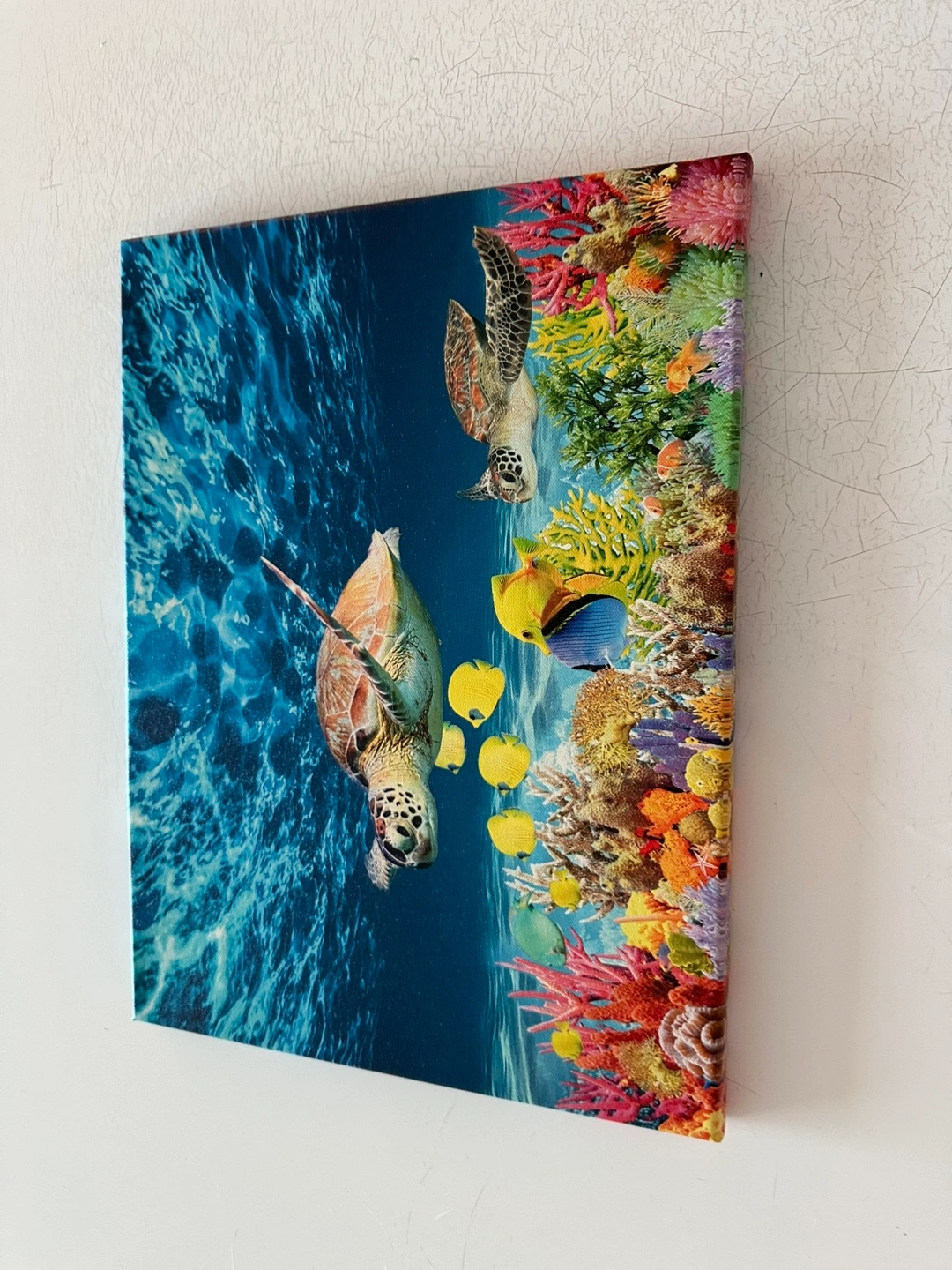 Canvas art of underwater scene. Features sea turtles, fish, and coral. Displaying a calming image in your home can create a feeling of serenity.