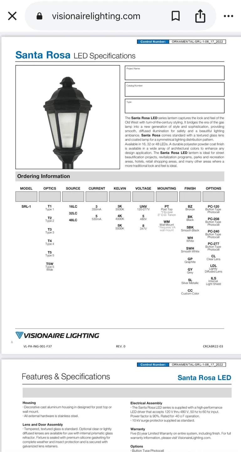 I'm selling a Visionaire Lighting Santa Rosa LED street lamp. It's a decorative cast aluminum housing designed for post or top mounting. The external hardware is stainless steel. The tempered textured glass is standard. It's approximately 31 inches tall and requires 120-277 voltage.