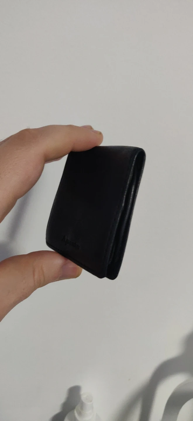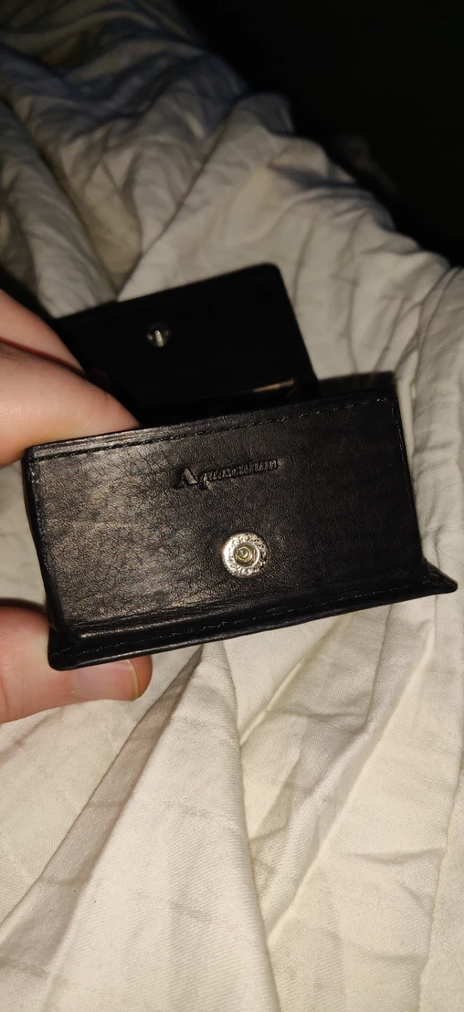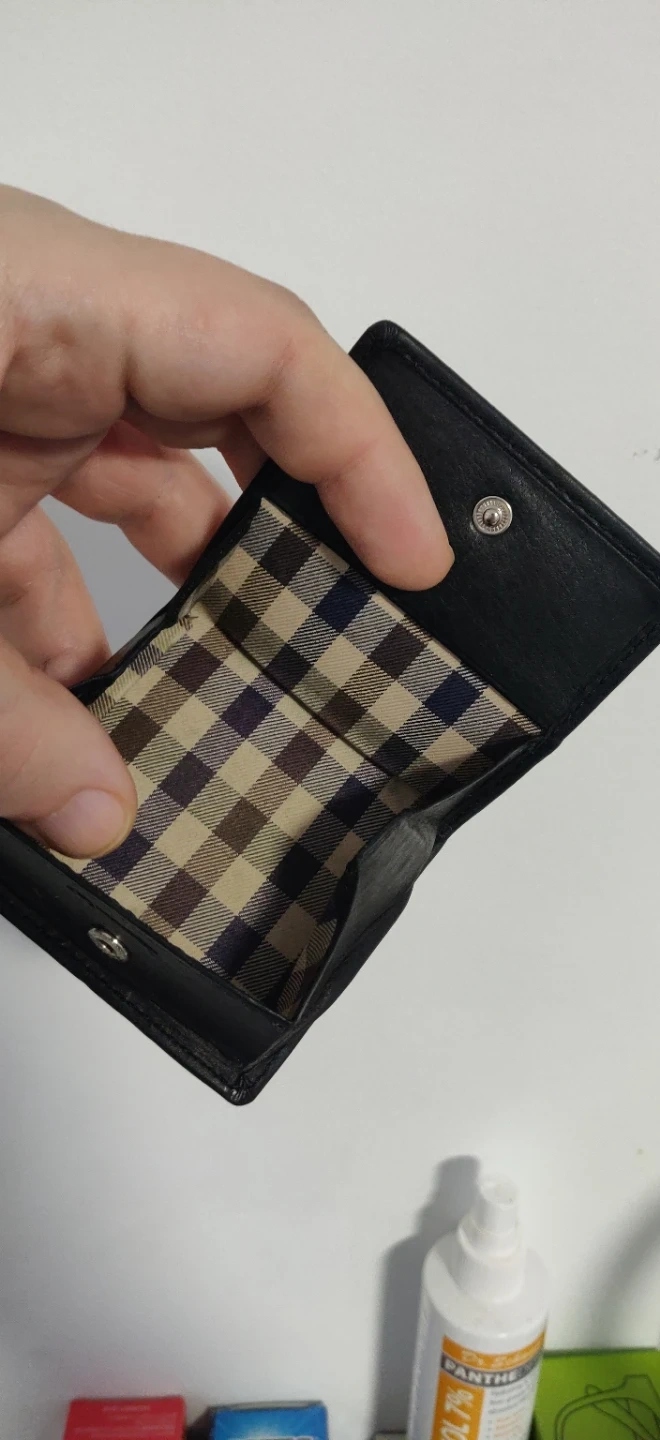 This is a premium black leather coin purse by UK Aquascutum. It has a snap closure and a plaid fabric lining. Perfect for keeping your change organized!