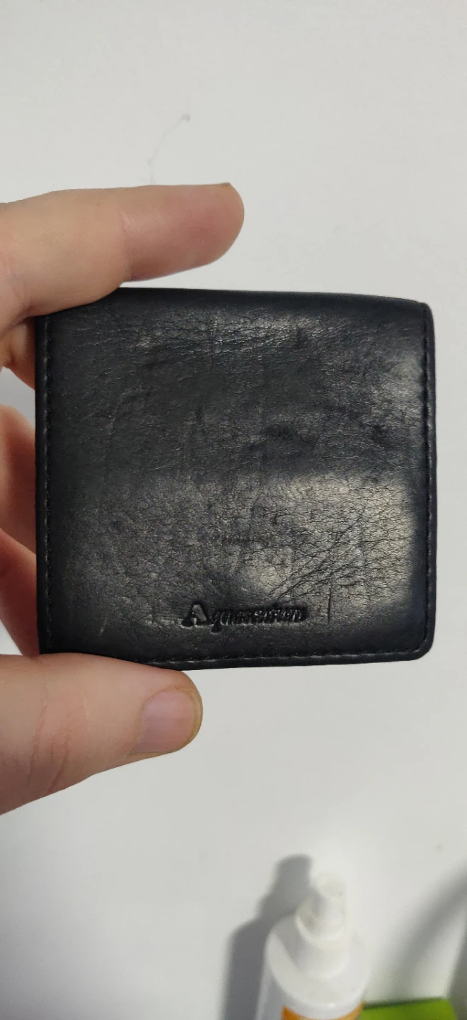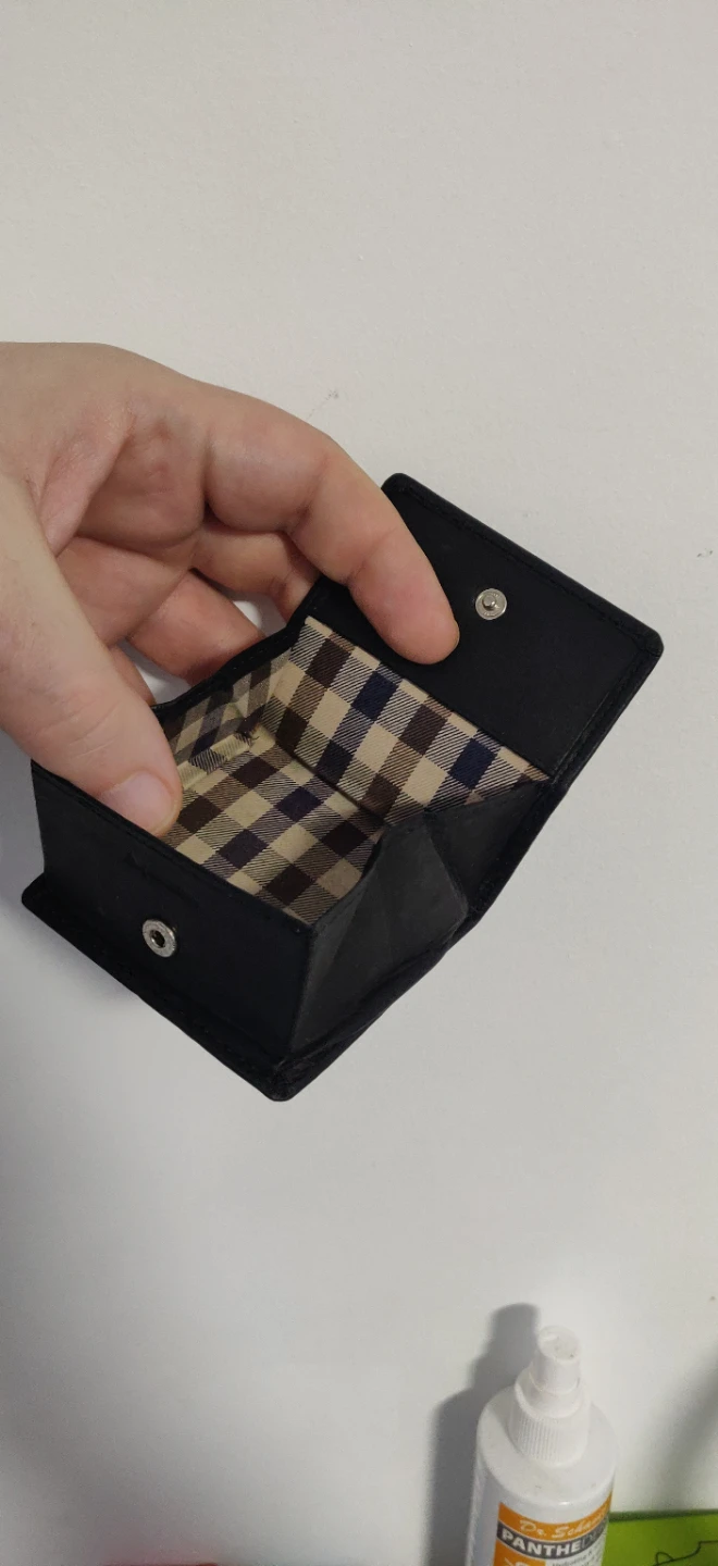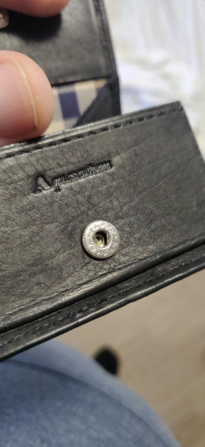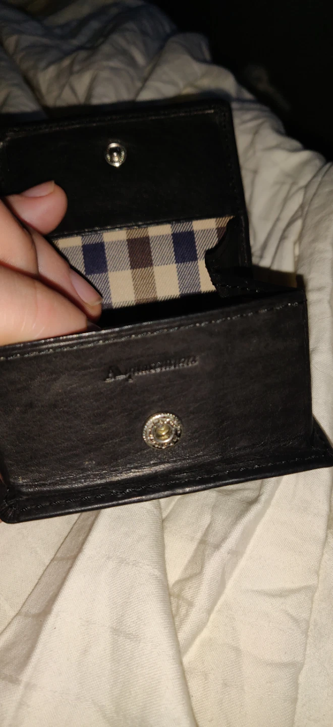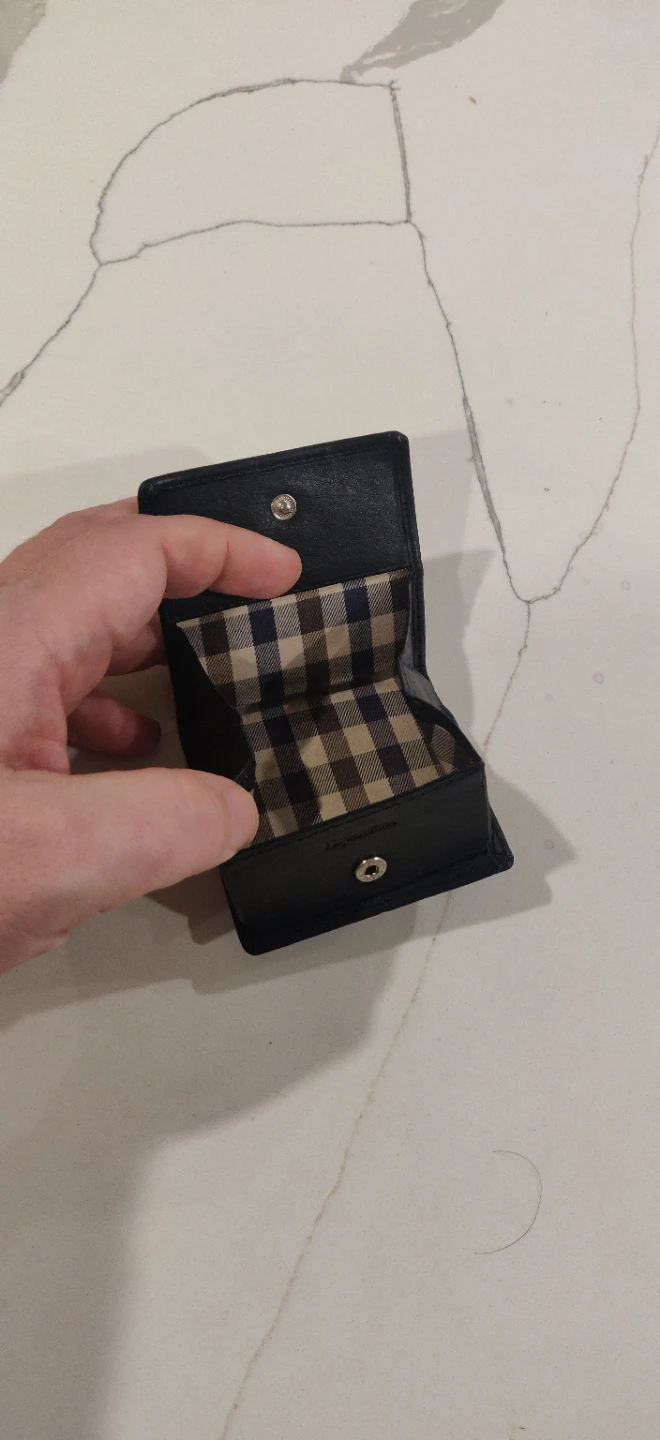 This is a premium black leather coin purse by UK Aquascutum. It has a snap closure and a plaid fabric lining. Perfect for keeping your change organized!
