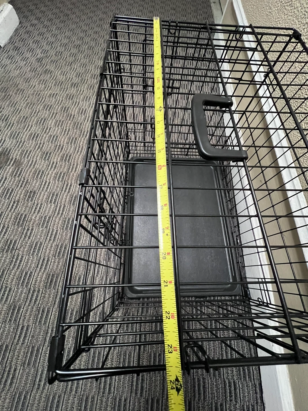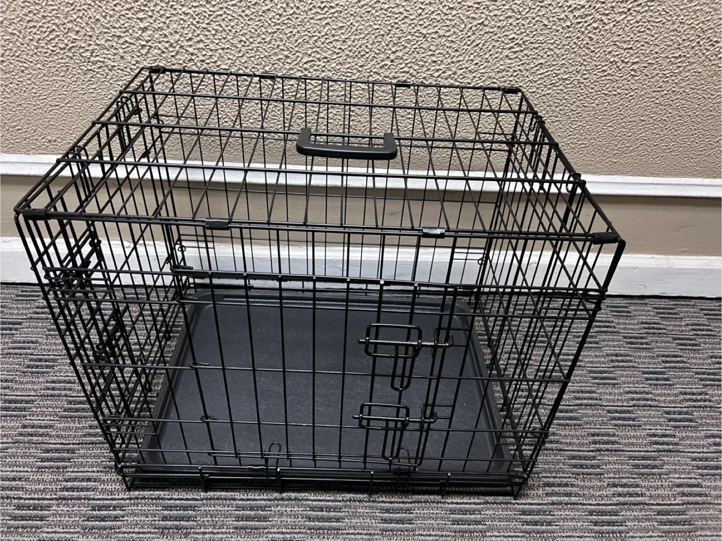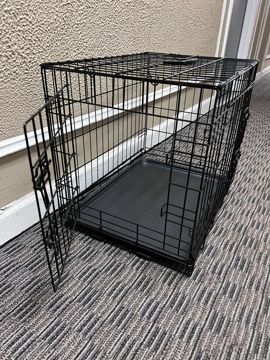 Black wire dog crate. It includes a removable plastic tray. Measures approximately 24inches long, 17inches wide, and 19inches tall. Features a hinged front door with secure latches. This crate's construction provides good ventilation and visibility for your pet.