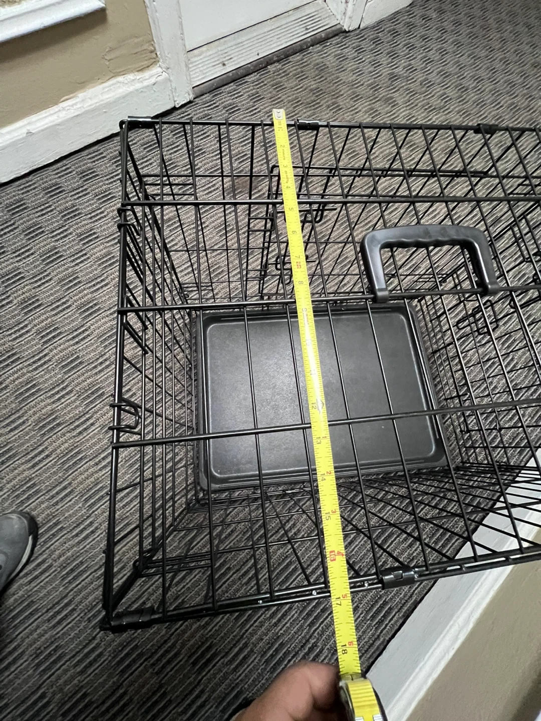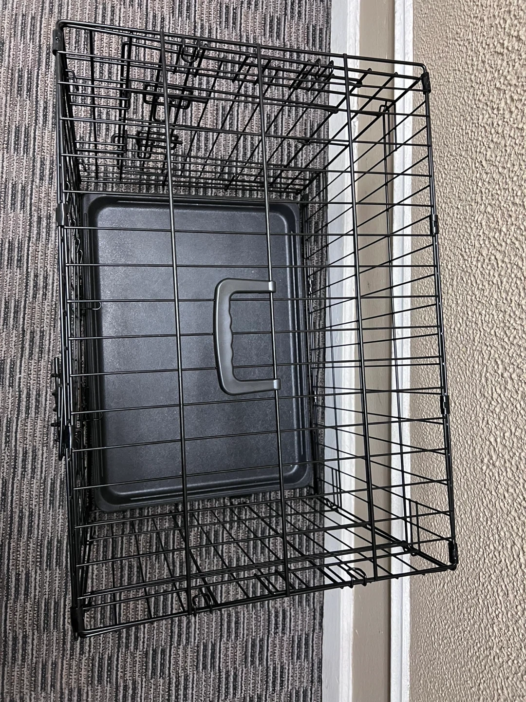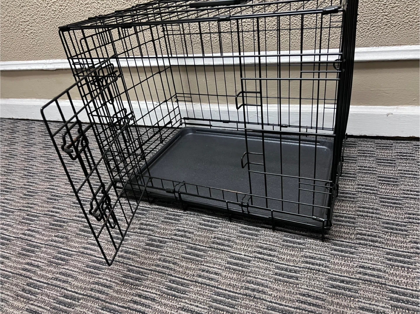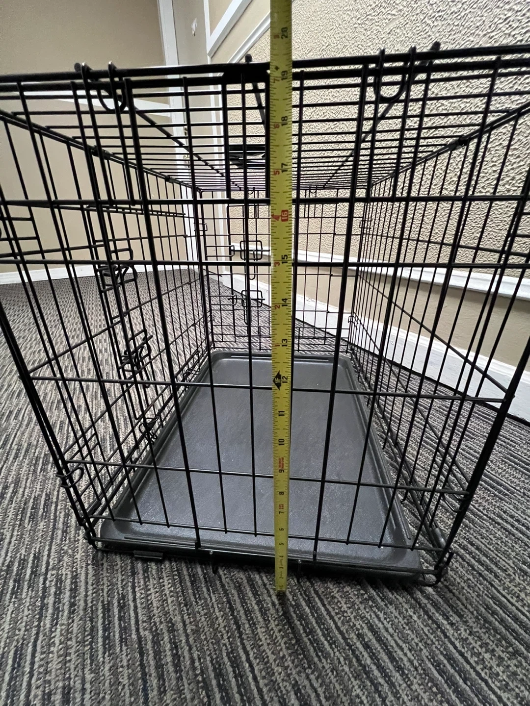 Black wire dog crate. It includes a removable plastic tray. Measures approximately 24inches long, 17inches wide, and 19inches tall. Features a hinged front door with secure latches. This crate's construction provides good ventilation and visibility for your pet.