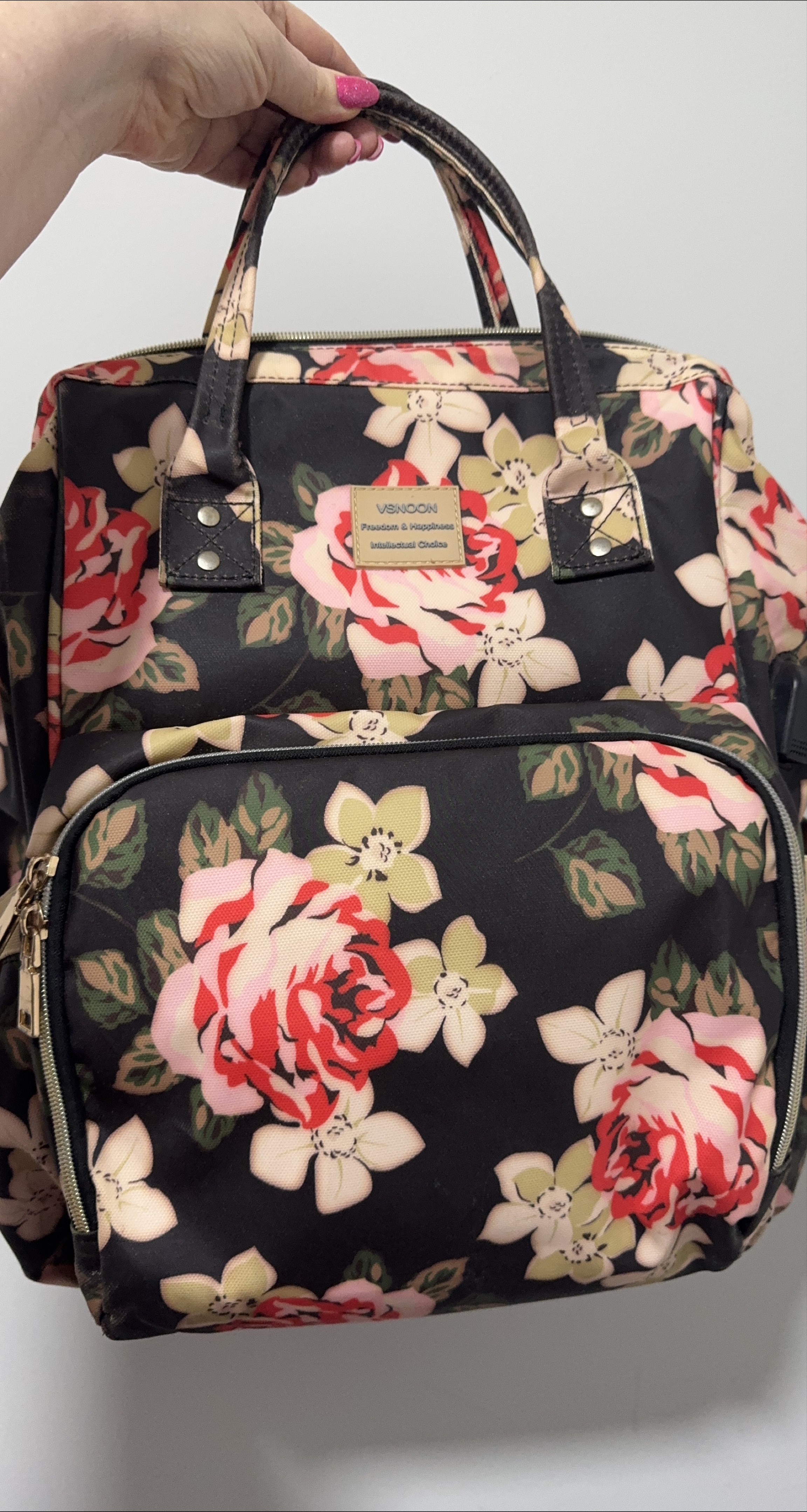 I'm selling a VSNOON backpack with a lovely floral print. It features a black background with red, pink, and white roses and other flowers. The bag has brown handles and gold-colored zippers. Perfect for carrying your essentials in style