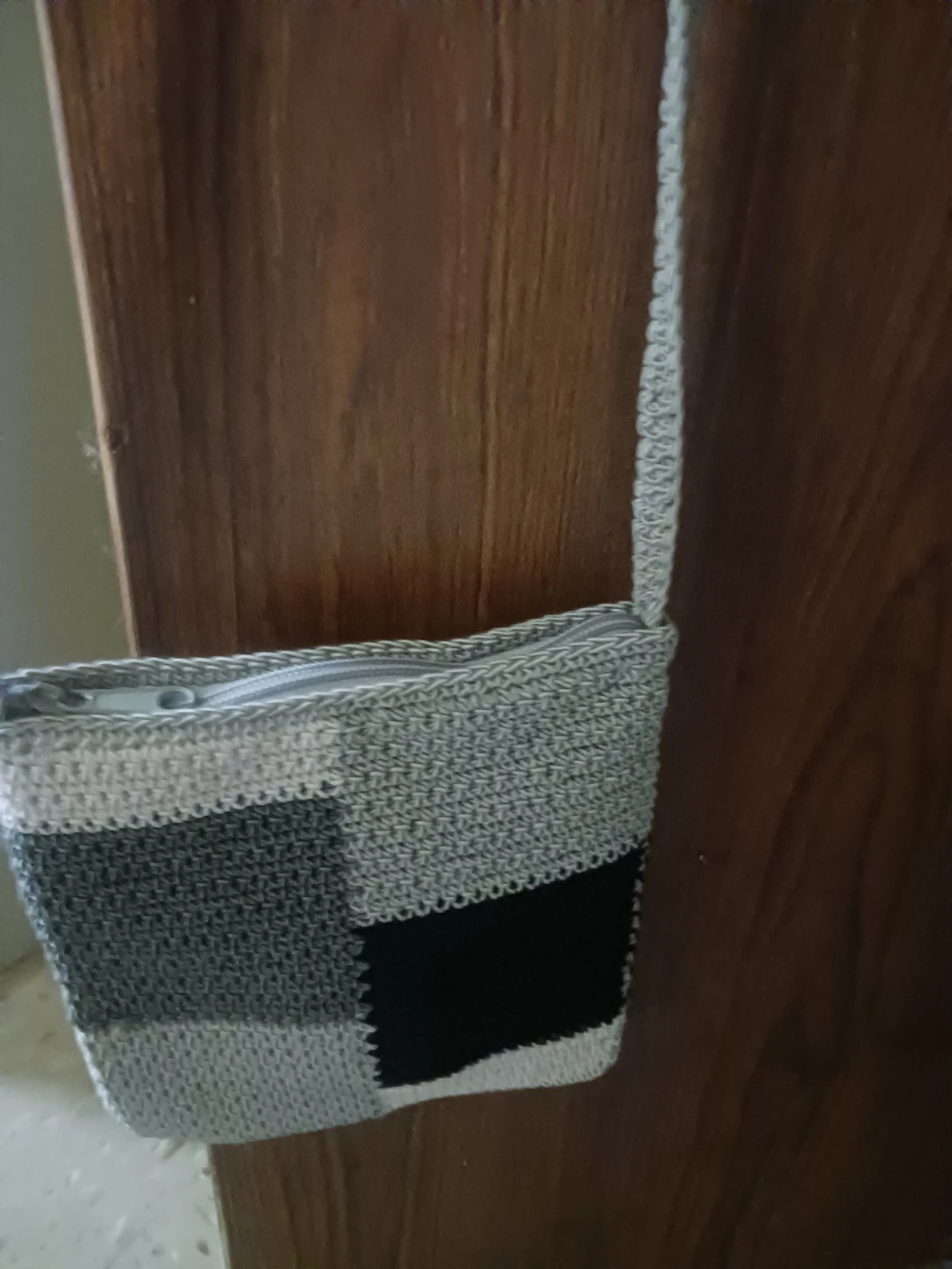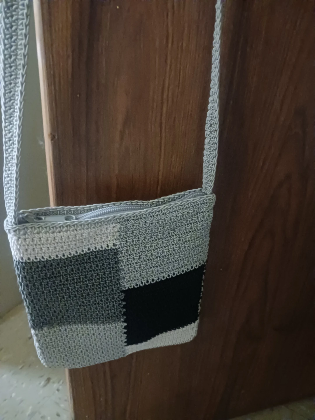 This small crocheted sling bag features a patchwork design with squares in white, gray, and black. It's fully lined and has a zipper closure. The strap is also crocheted. This bag is great for carrying essentials.