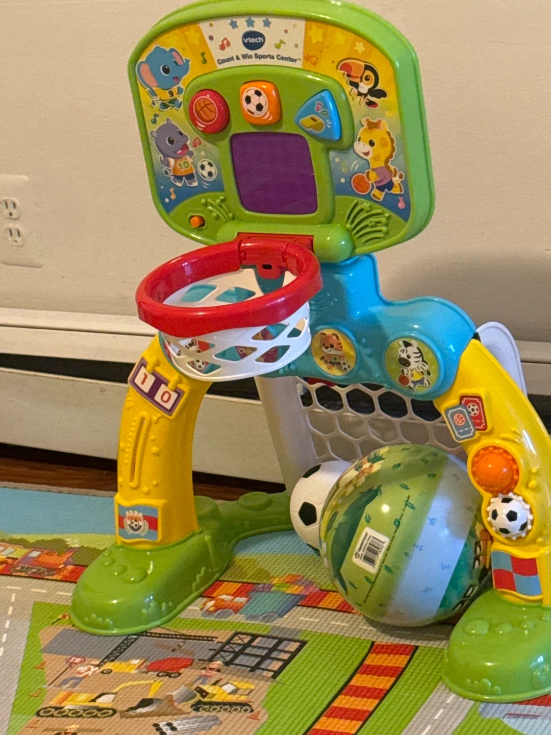 Selling a VTech Count & Win Sports Center! It's a fun, interactive toy that combines basketball and soccer. Your little one can practice their motor skills while learning to count. It's in great condition and ready for a new home!
