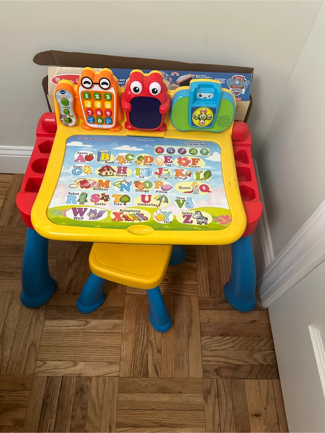 Selling a VTech Touch & Learn Activity Desk Deluxe! It's a great interactive learning tool for kids. The desk features alphabet and letter sounds, along with various activities to keep your little one engaged. Also includes two sheets for extra activities. It's in good condition and ready for a new home!