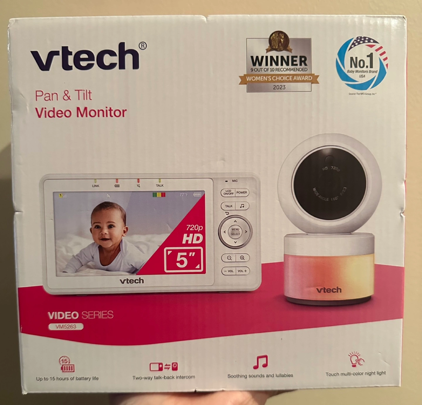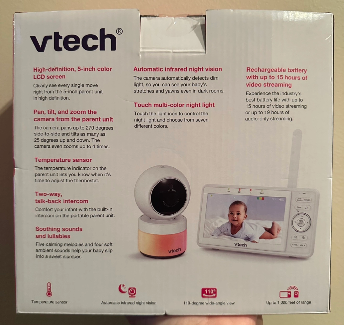 965-inch LCD screen. Pan, tilt, and zoom. Two-way intercom. Temperature sensor. Automatic infrared night vision. Soothing sounds and lullabies. Rechargeable battery with up to 15 hours of video streaming.