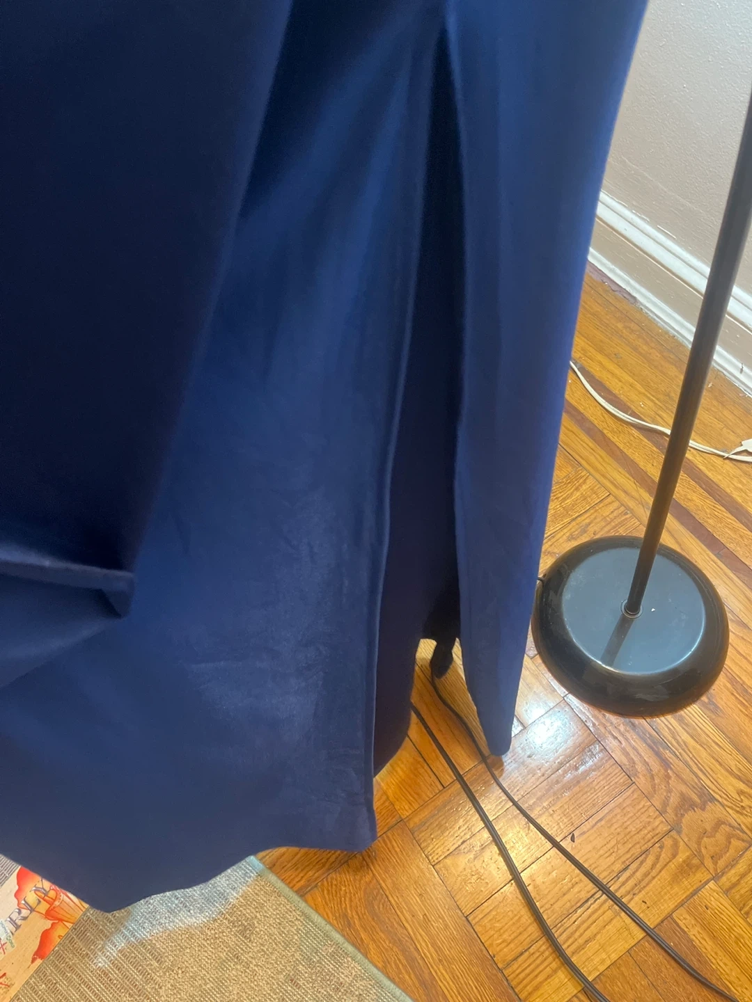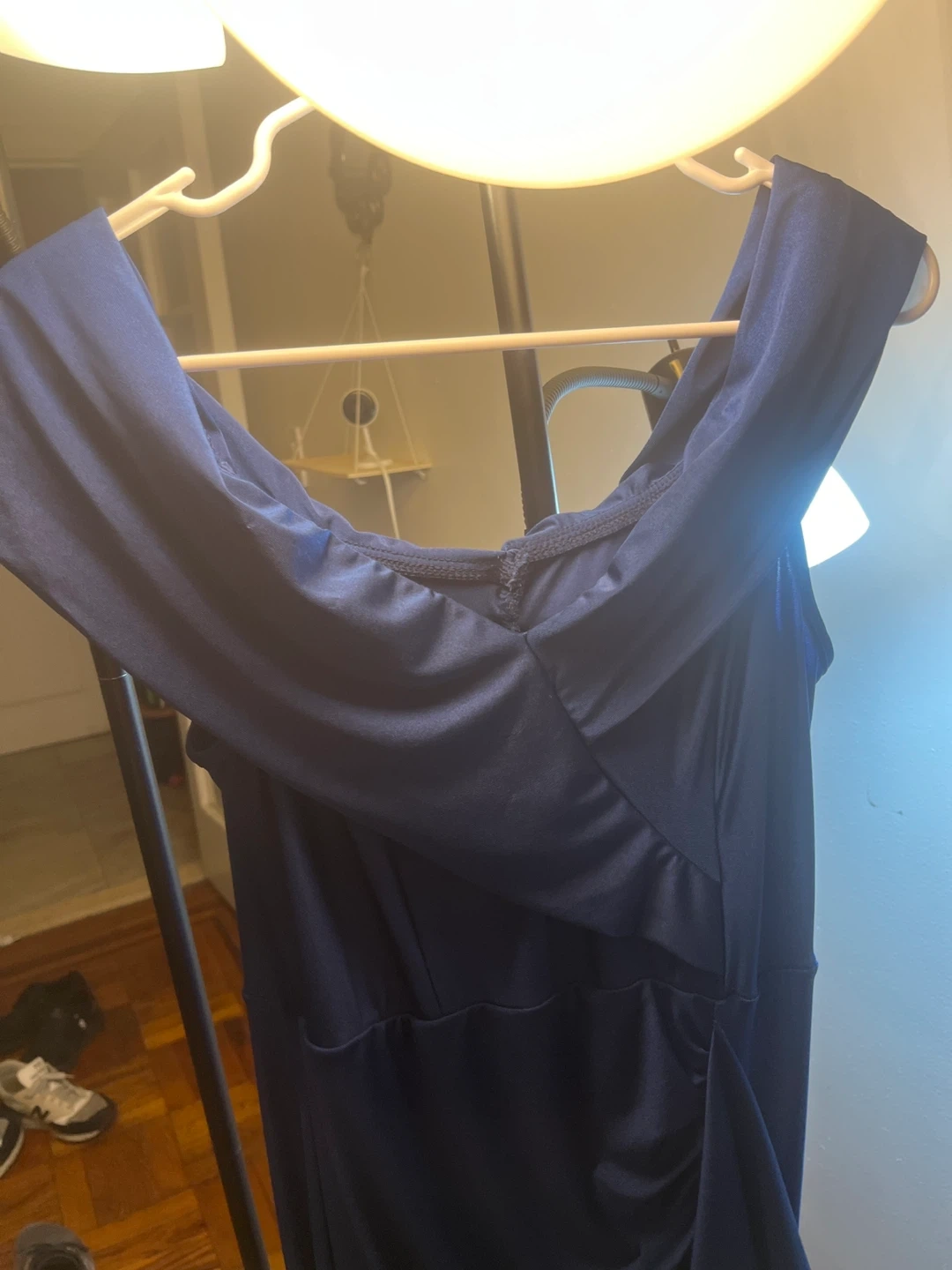 This navy blue gown features an elegant off-the-shoulder neckline and stylish ruching on the side. It's designed with a flattering silhouette and includes a tasteful thigh-high slit for ease of movement. The material has a subtle They shape the body for a medium or large size, they stretch and adjust