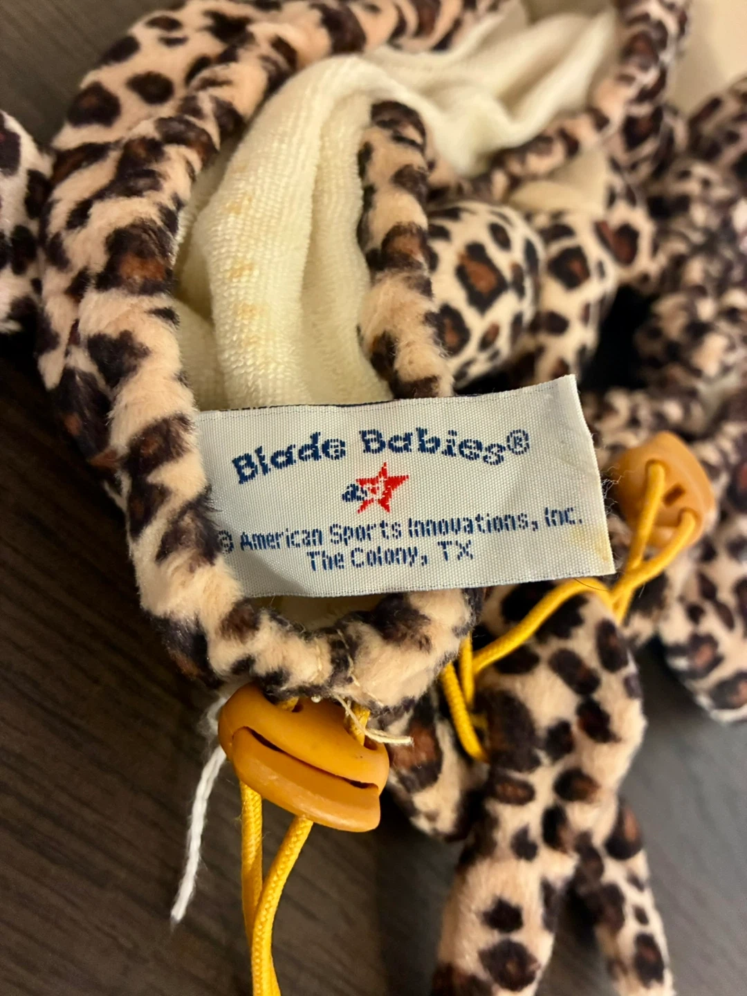 75The VTG Blade Babies Brand Cheetah Cat Soaker Ice Skate Blade Cover Protect Guard is an ice skate guard designed by MONDOR under their Blade Babies brand. The guard features a multicolor cheetah design and serves the purpose of protecting ice skates from damage . Specifically tailored for ice skating, this blade cover offers a stylish and functional accessory for skaters looking to safeguard their blades.
