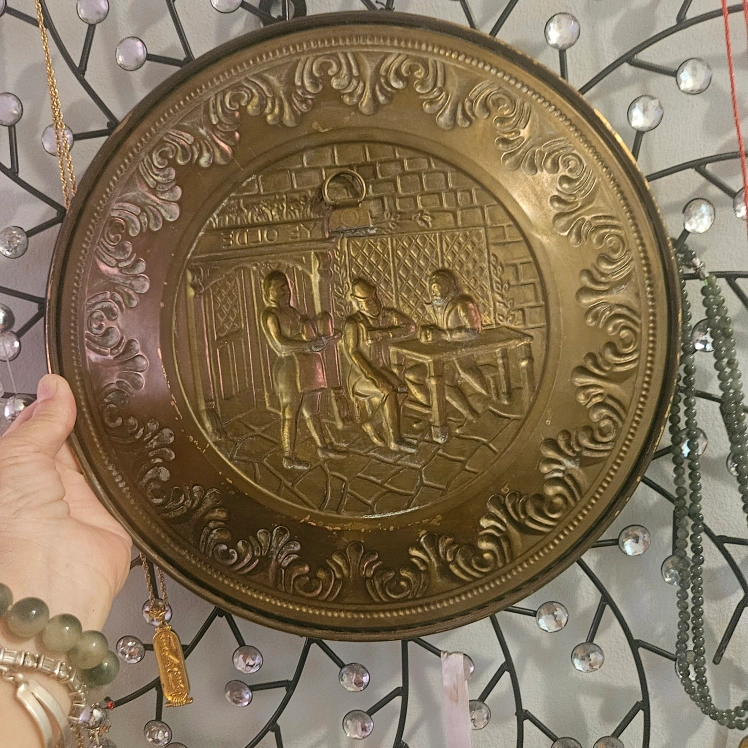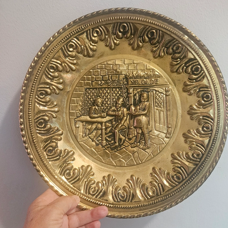 Vintage England Tavern Wall Hammered Brass ART Colonial Scene.