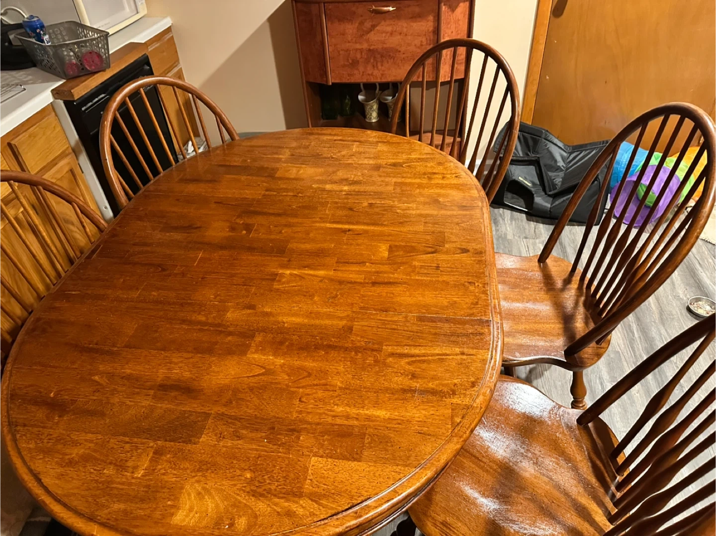 This set includes an oval heavy wooden dining table with six matching chairs. The chairs have a classic spindle back design. It's a nice set for a kitchen or dining area.