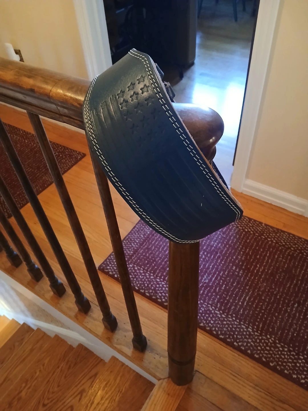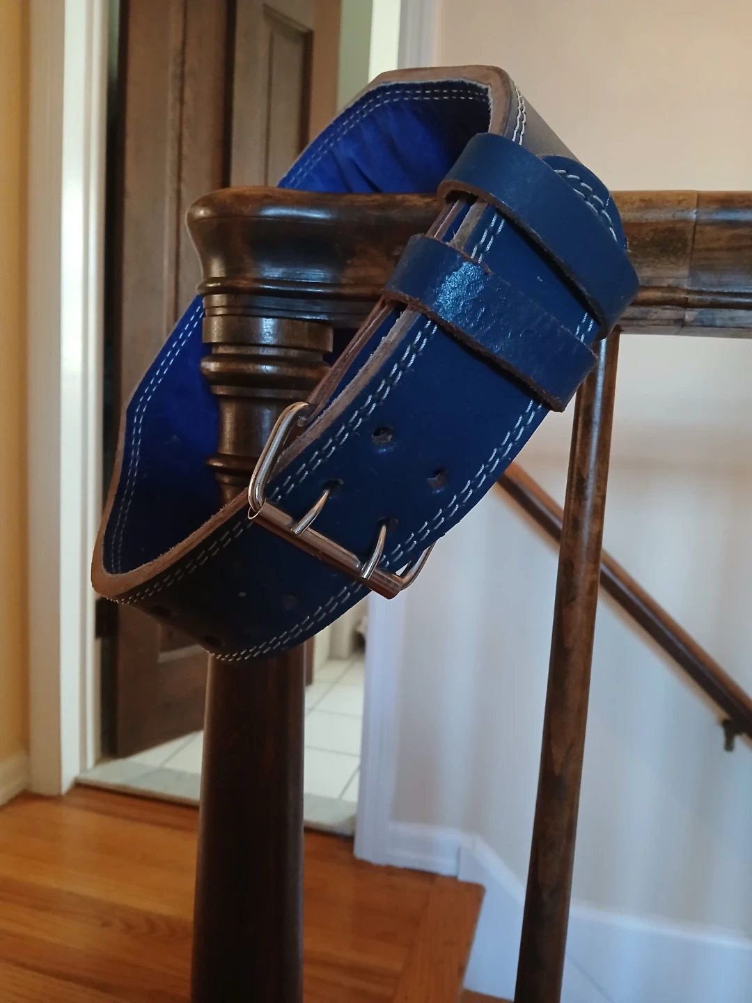 This blue weightlifting belt provides back support during heavy lifts. It's made of leather with a double prong buckle. Size S/M. The belt features embossed American flag stars and stripes.