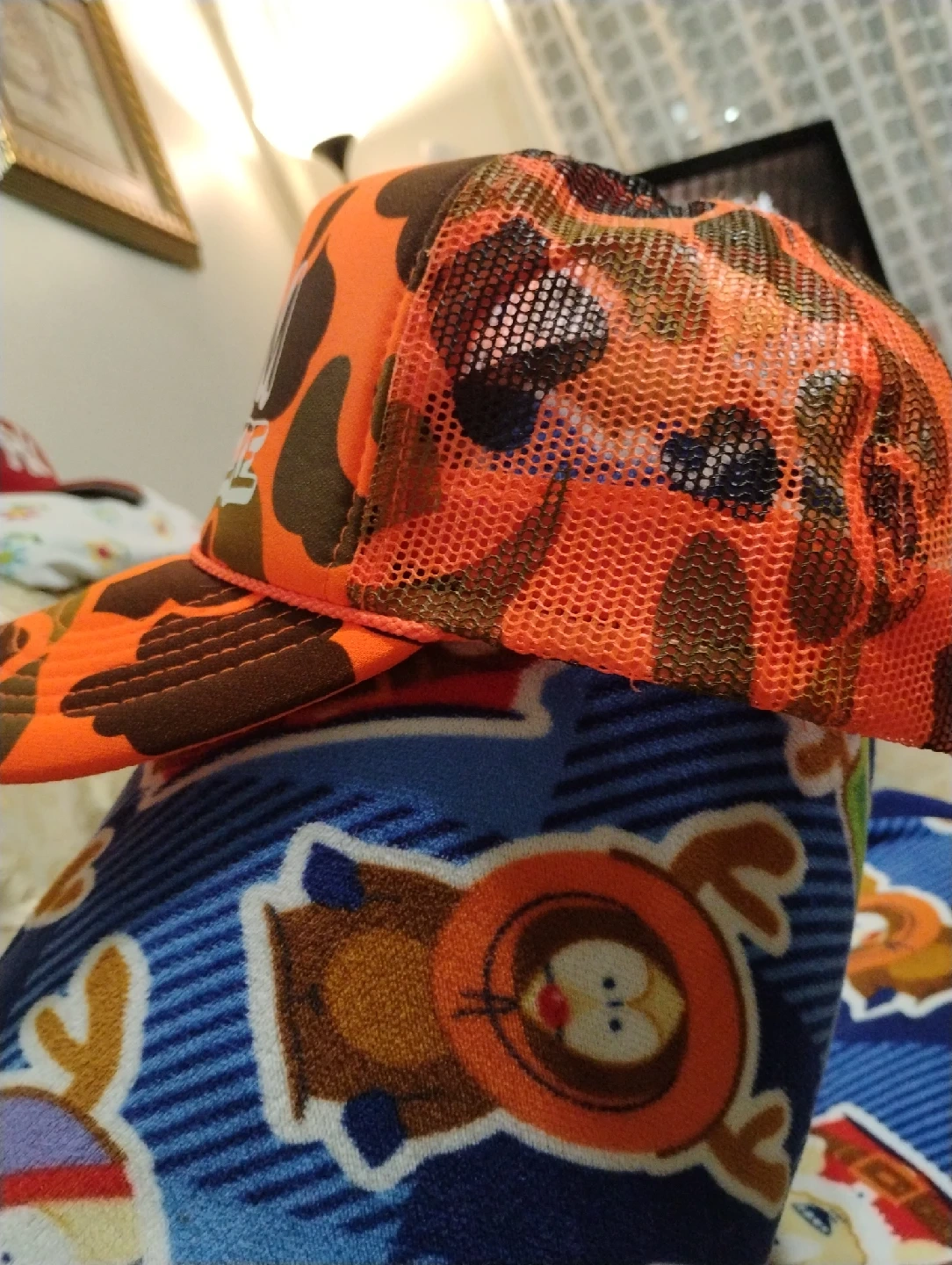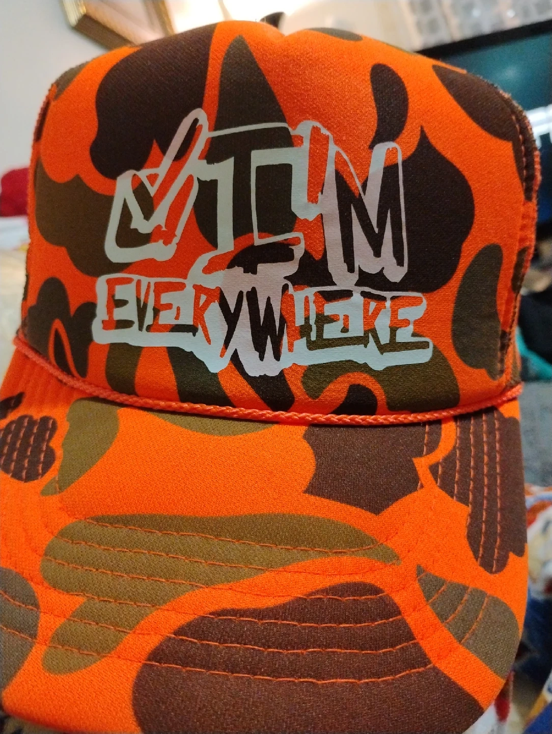 5Cool orange camo trucker hat with a unique design! It features 'VTM Everywhere' in bold lettering. Perfect for adding a pop of color to your outfit.