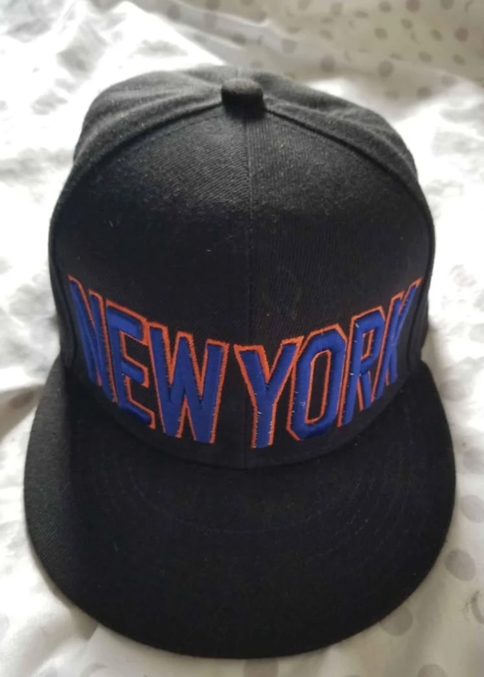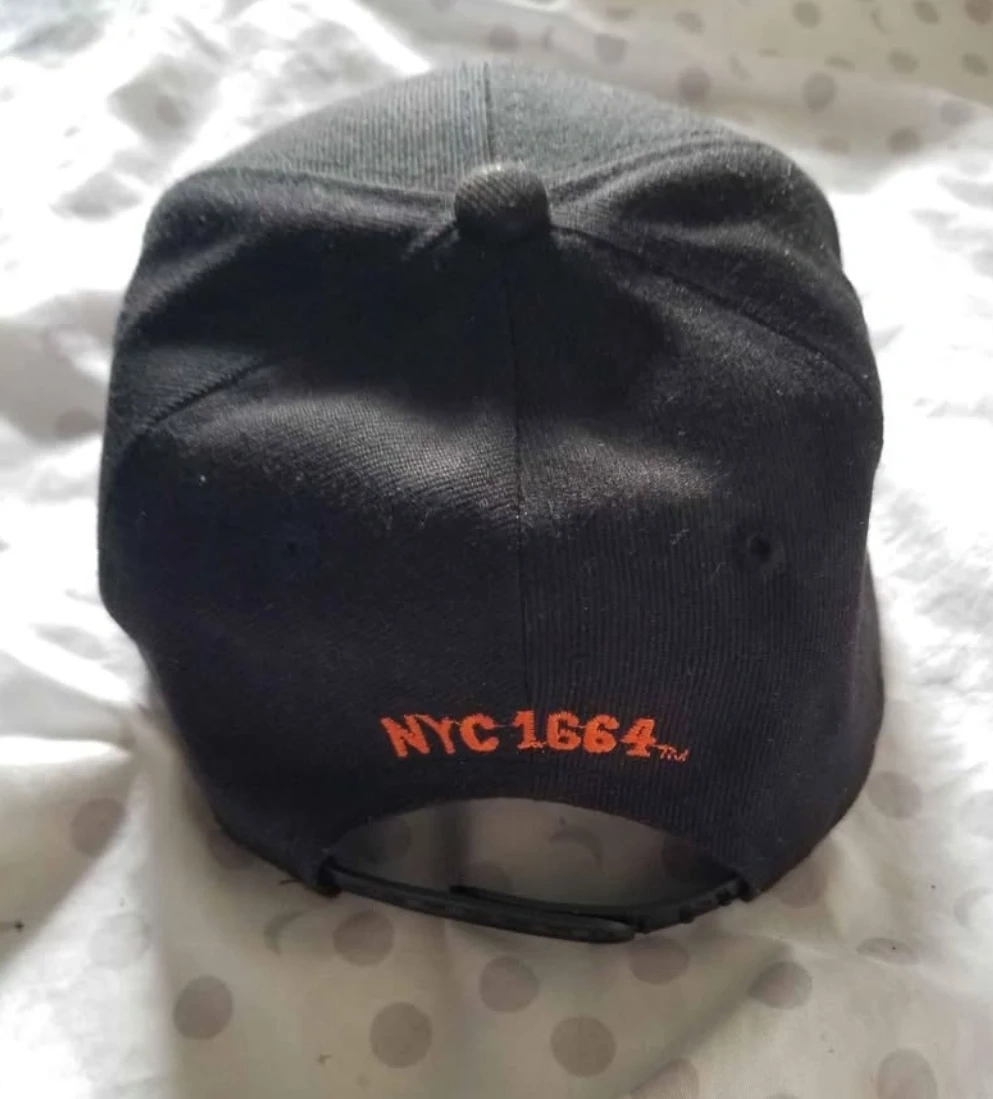 Black snapback hat. Features orange and blue embroidered New York lettering. NYC 1664th embroidered on the back.