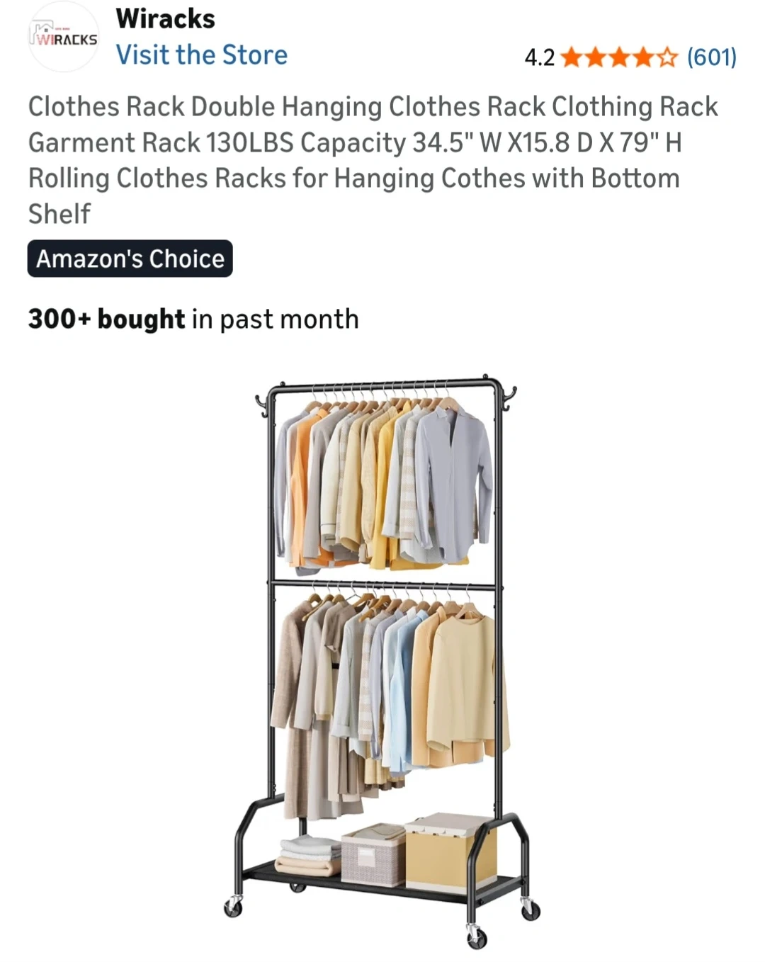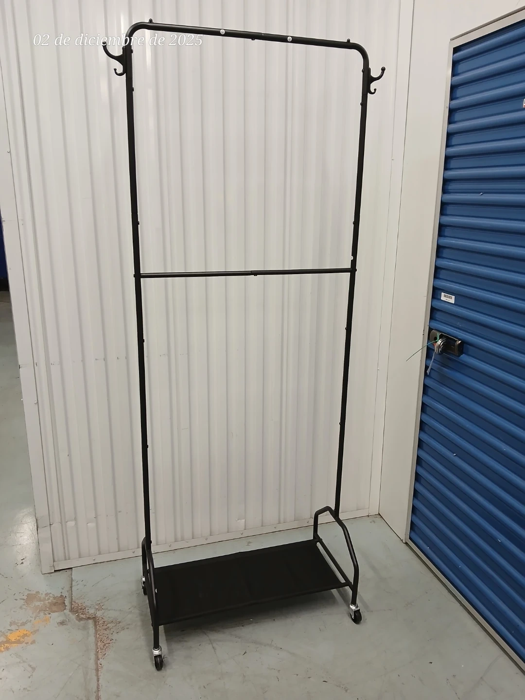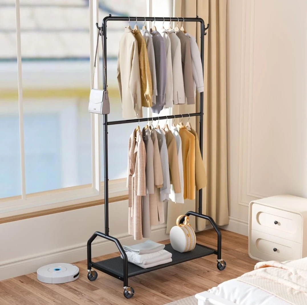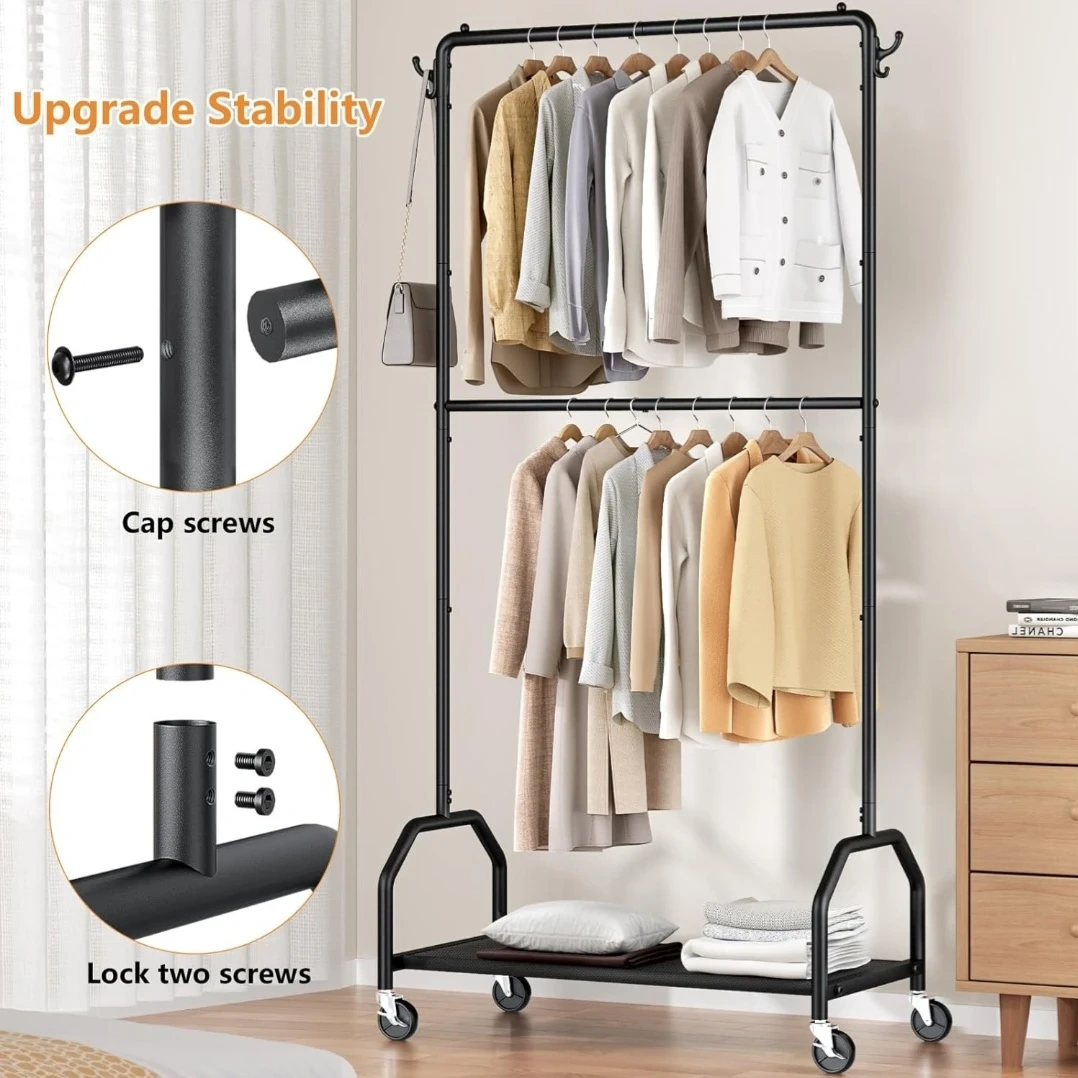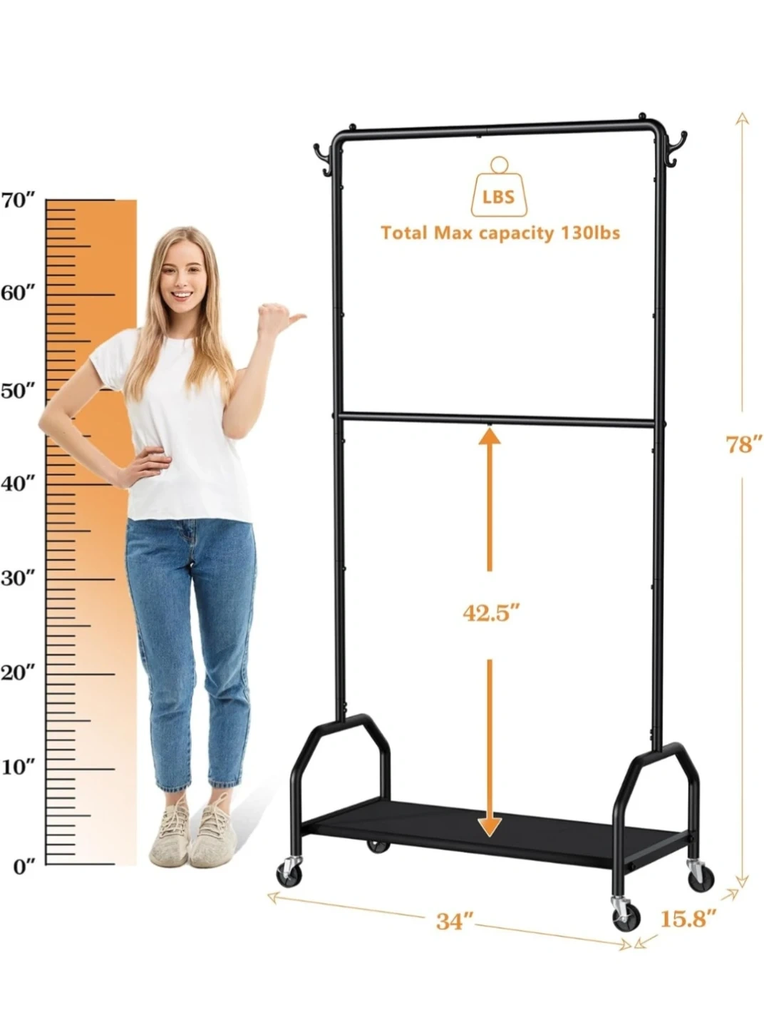 This is a black metal garment rack with a bottom shelf. It has a total max capacity of 130lbs and includes wheels for mobility. The rack is 78 inches tall.