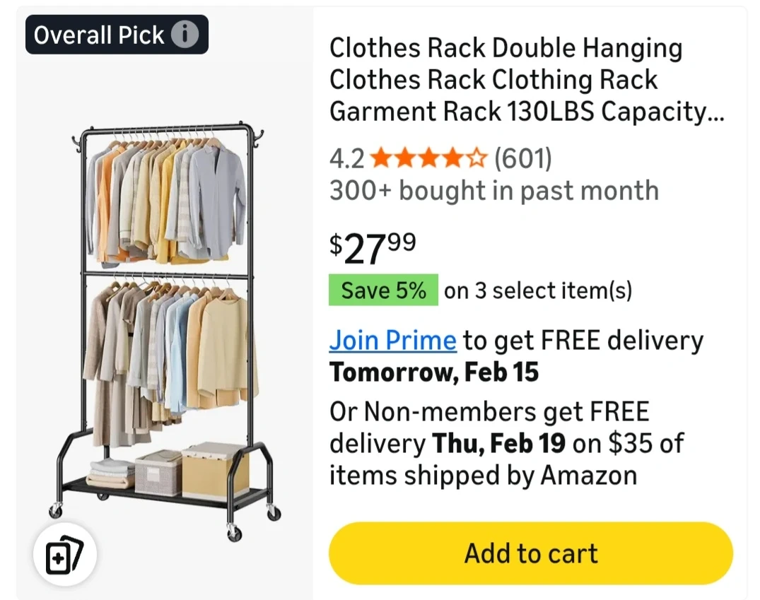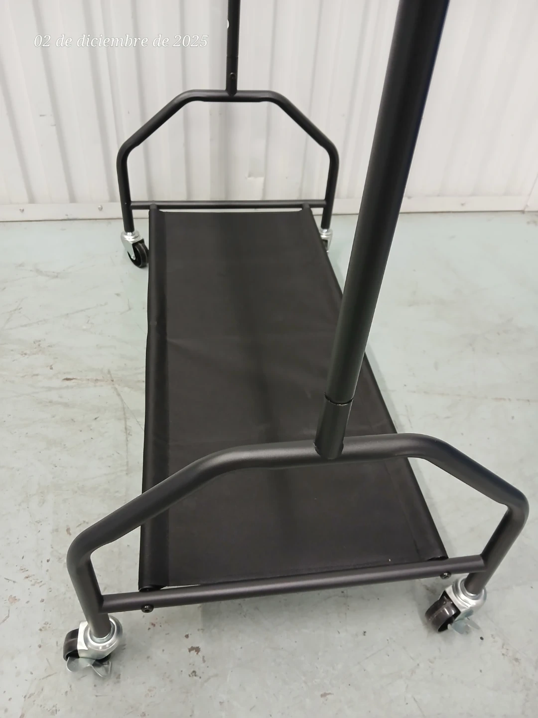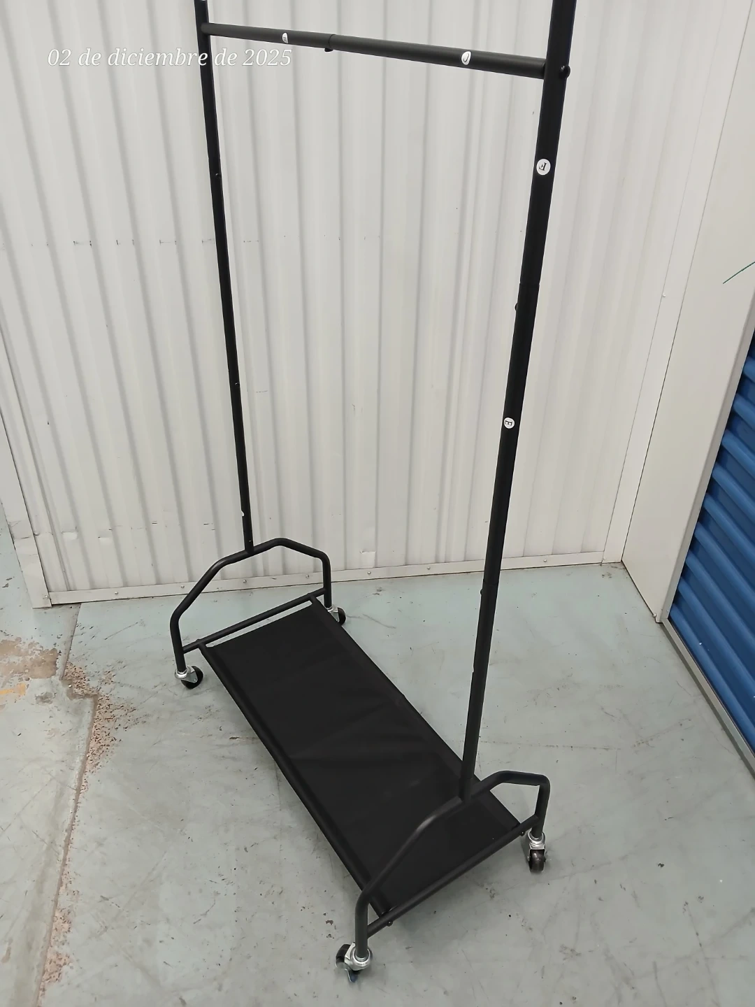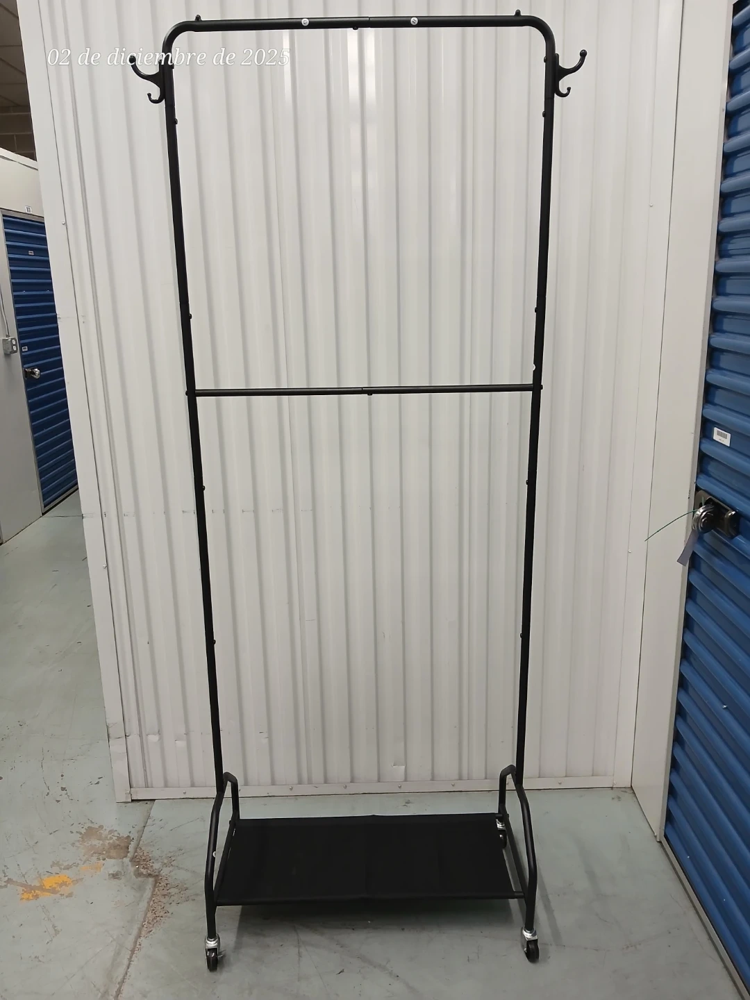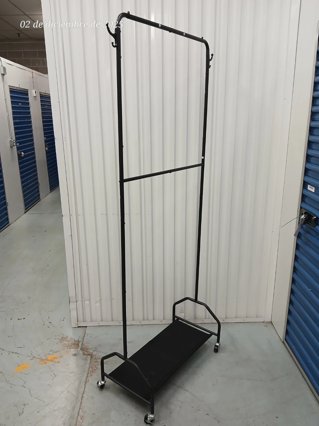 This is a black metal garment rack with a bottom shelf. It has a total max capacity of 130lbs and includes wheels for mobility. The rack is 78 inches tall.