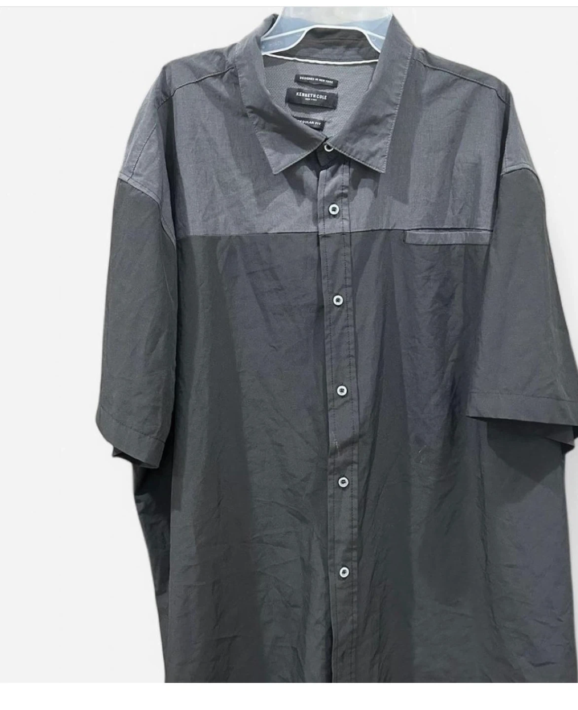 Kenneth Cole short sleeve button-down shirt with a colorblock design. It features a chest pocket and a regular fit. The material is a blend of cotton and polyester.