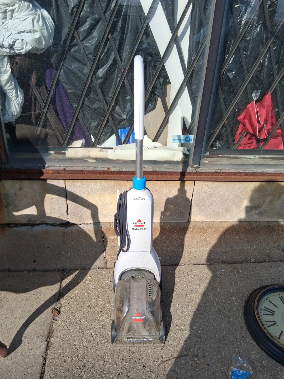 This Bissell ReadyClean carpet cleaner features a Cross Action brush. It's designed for cleaning carpets. It includes the power cord and dirt tank.