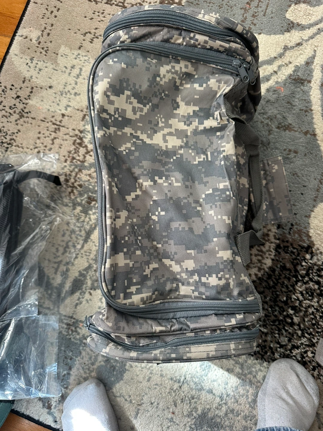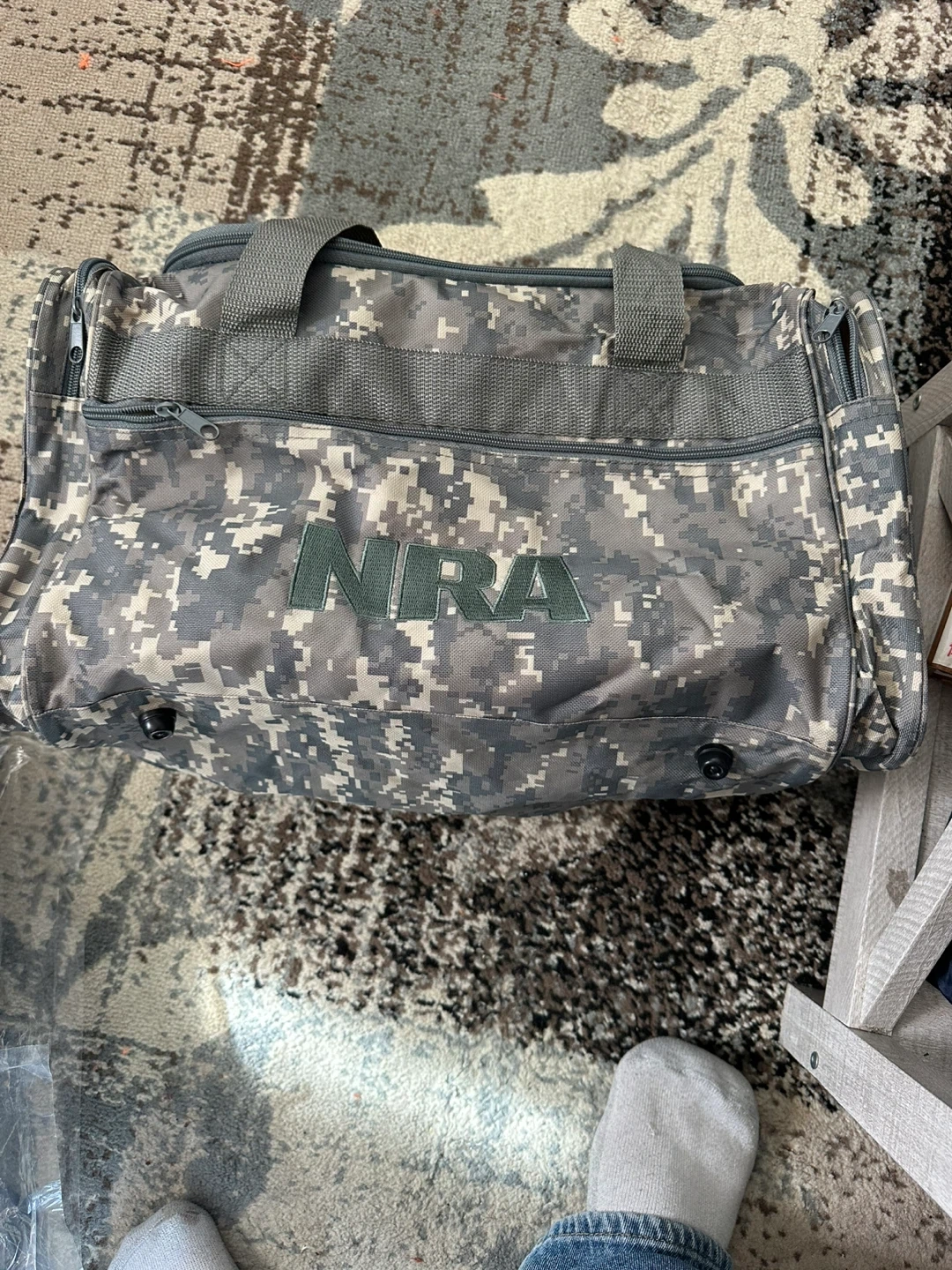 This NRA duffle bag features a digital camouflage pattern. It has a main zippered compartment and additional zippered pockets on the sides. This bag is suitable for carrying gear or travel.