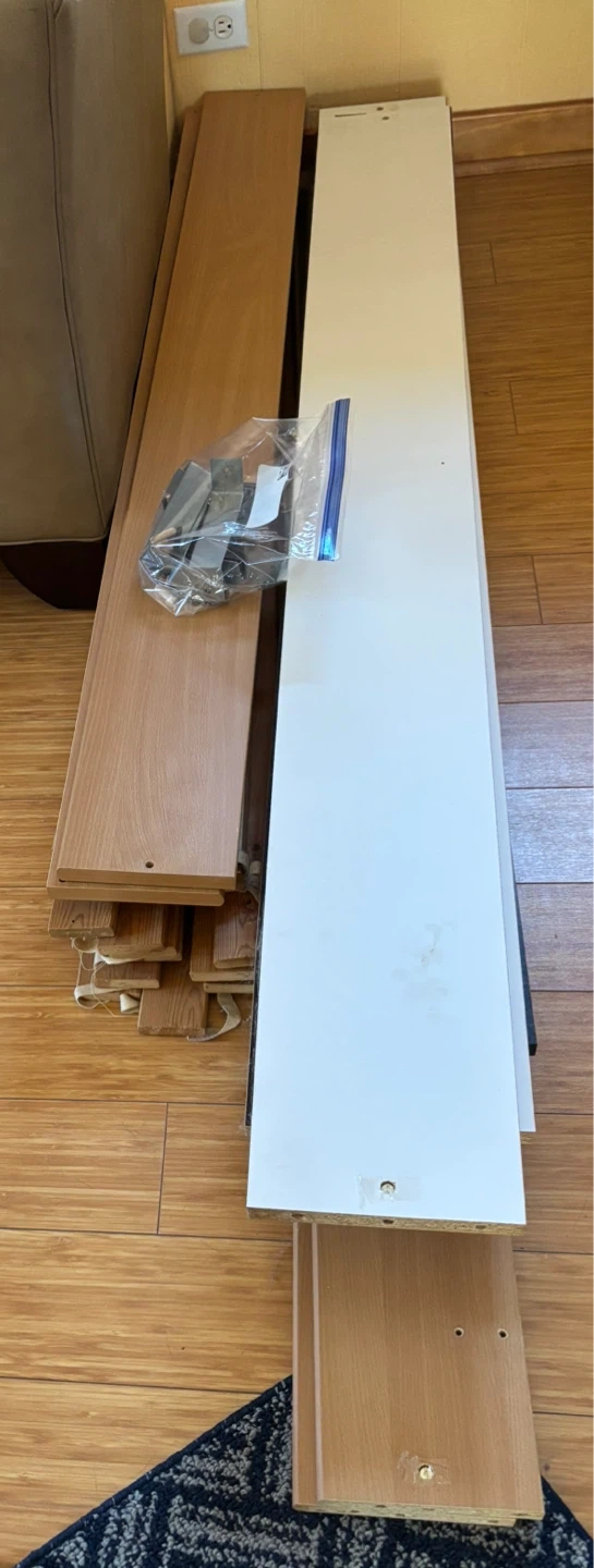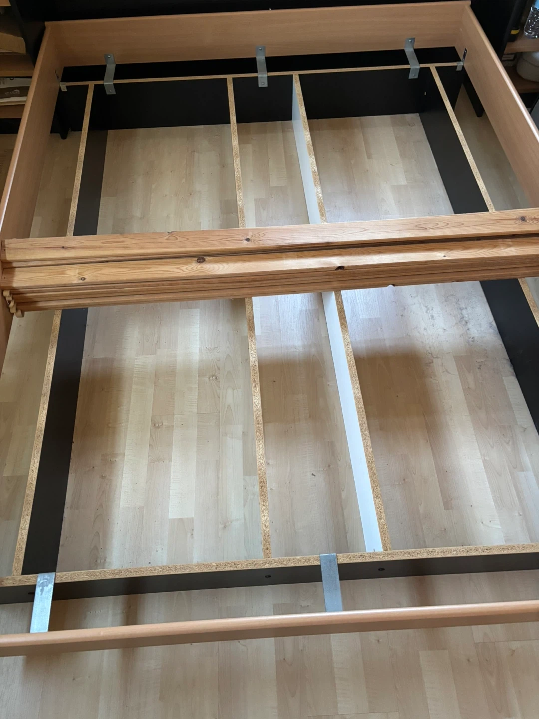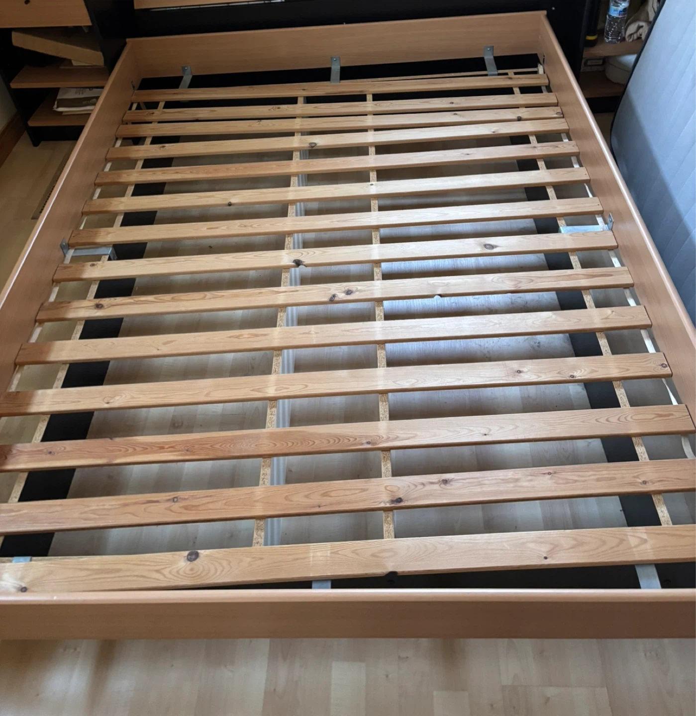 This is a wooden bed frame with a slatted base. It's made of wood and metal components for support. The frame is designed to hold a queen size mattress. There is no headboard or mattress included.
