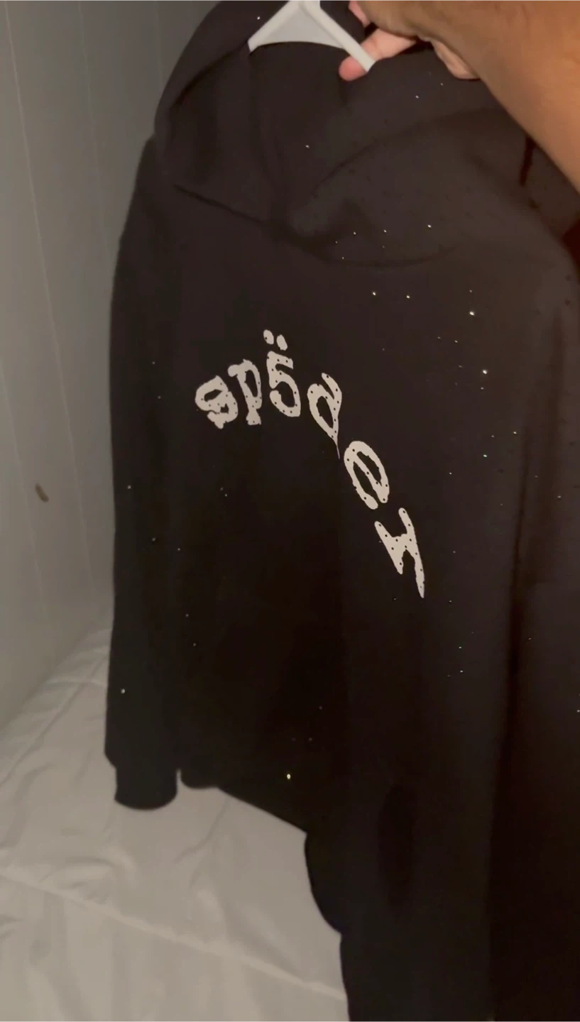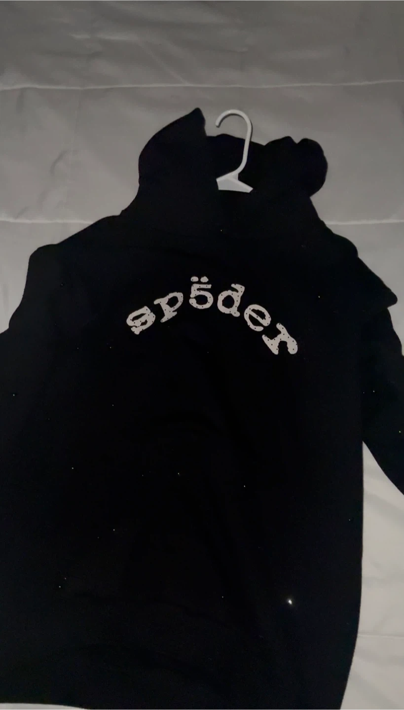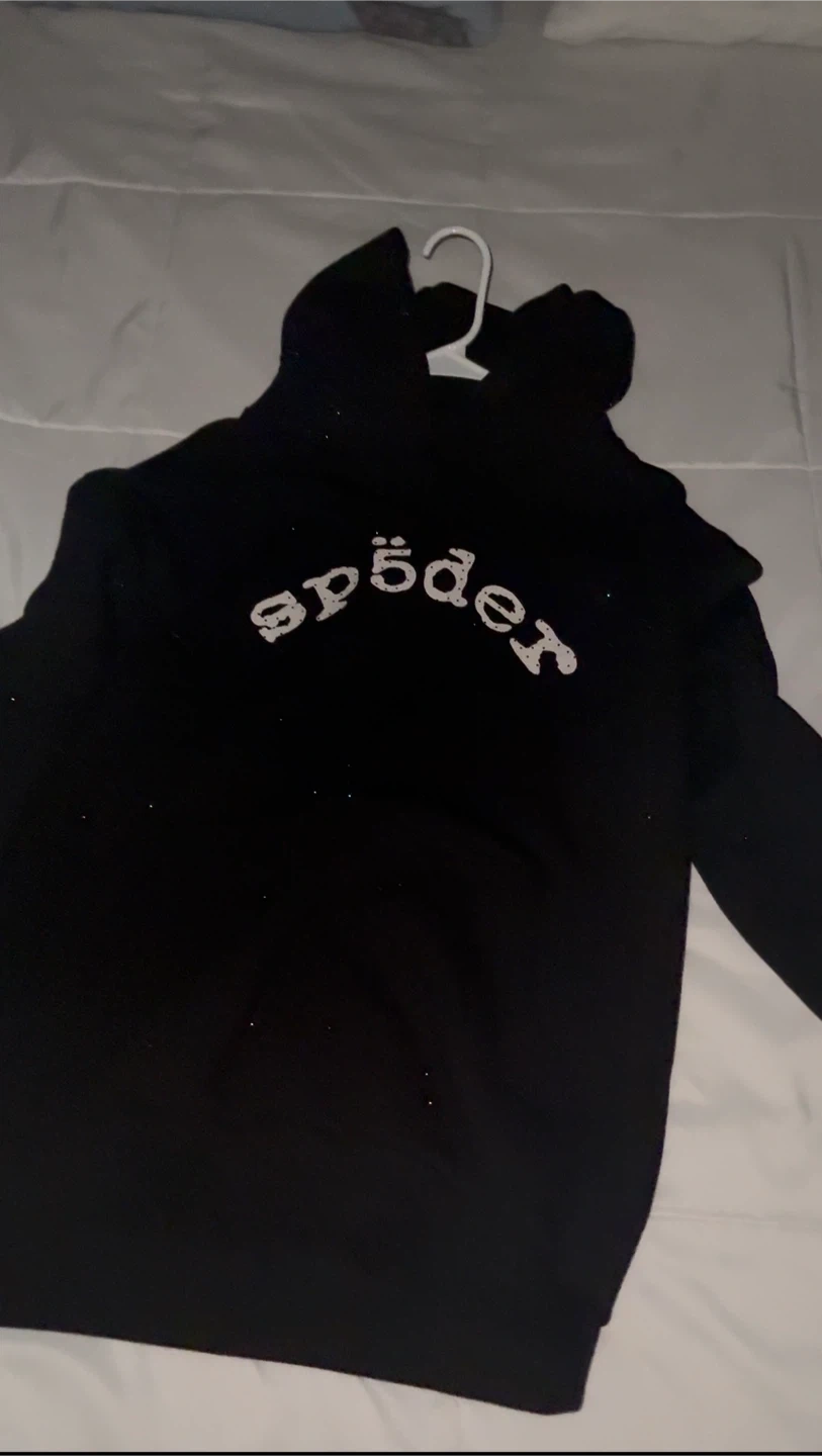 Selling a VVS black Sp5der hoodie. It features the Sp5der logo in a stylized font. •used • Size M •good condo •meet ups near me