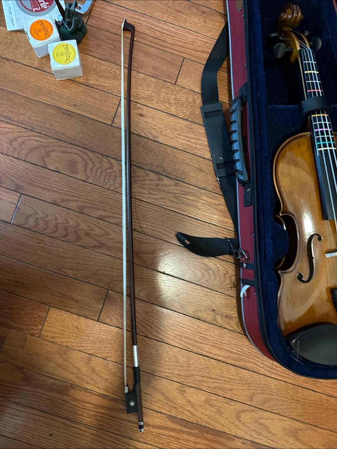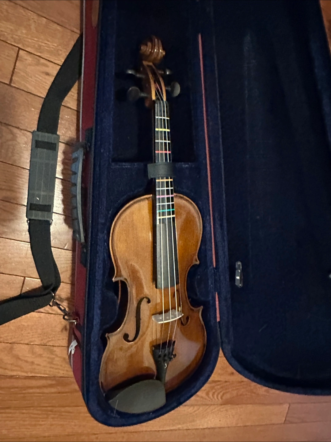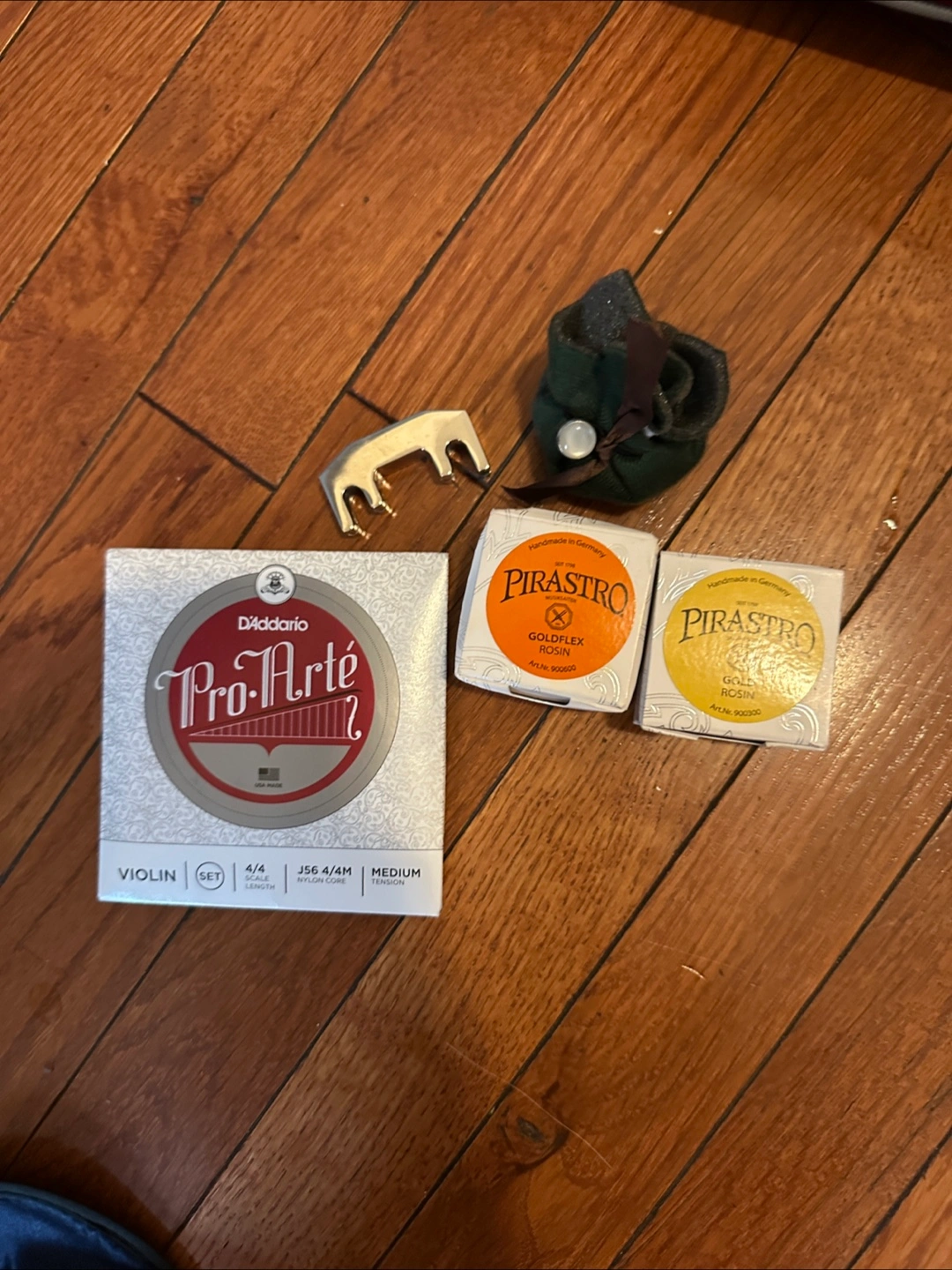 I'm selling a violin that's in good condition! It comes with a case and bow. Also included are D'Addario Pro-Arte violin strings and two Pirastro Rosin and another that I forget the name of. It also comes with a metal muffler and a removable fingers guide. Size 4/4