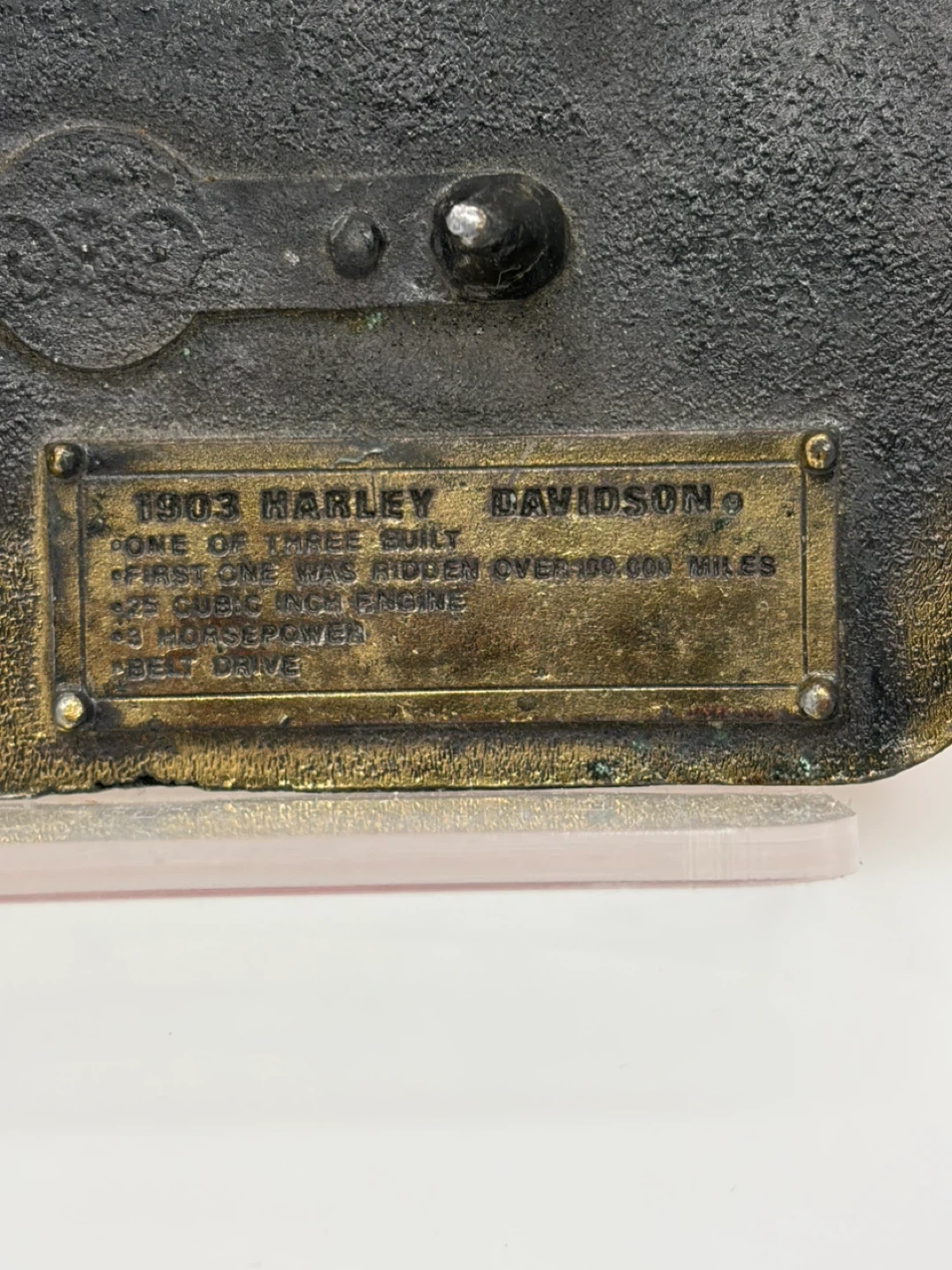 Collectible Harley-Davidson belt buckle featuring a 1903 motorcycle design. Includes details like 'One of Three Built,' 'First one was ridden over 100,000 miles,' '325 cubic inch engine,' '3 horsepower,' and 'belt drive.' Made of metal.