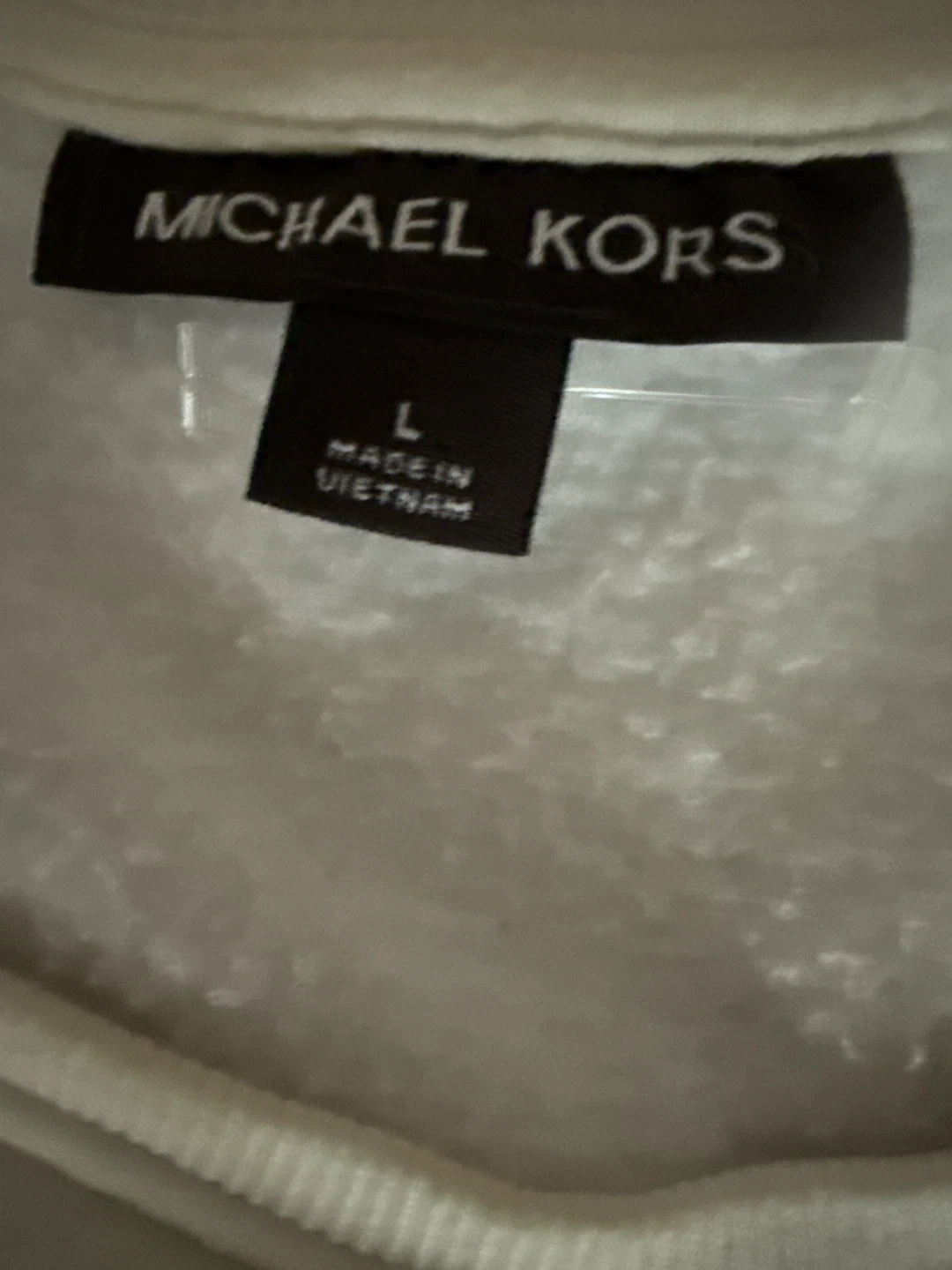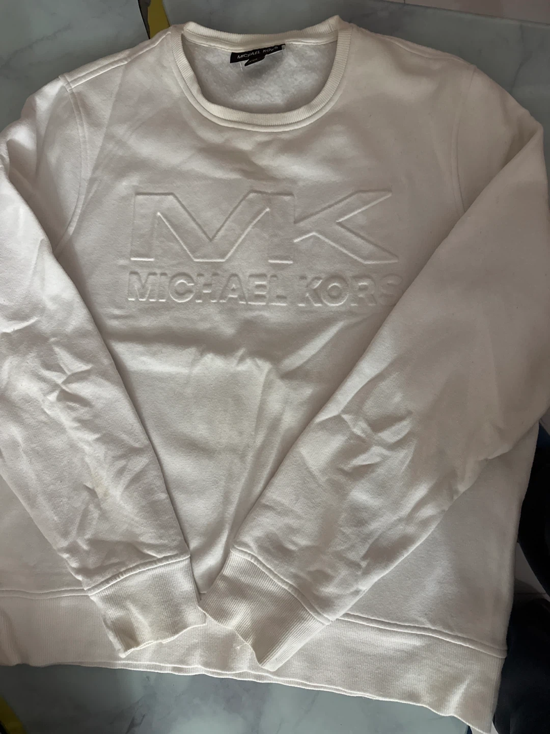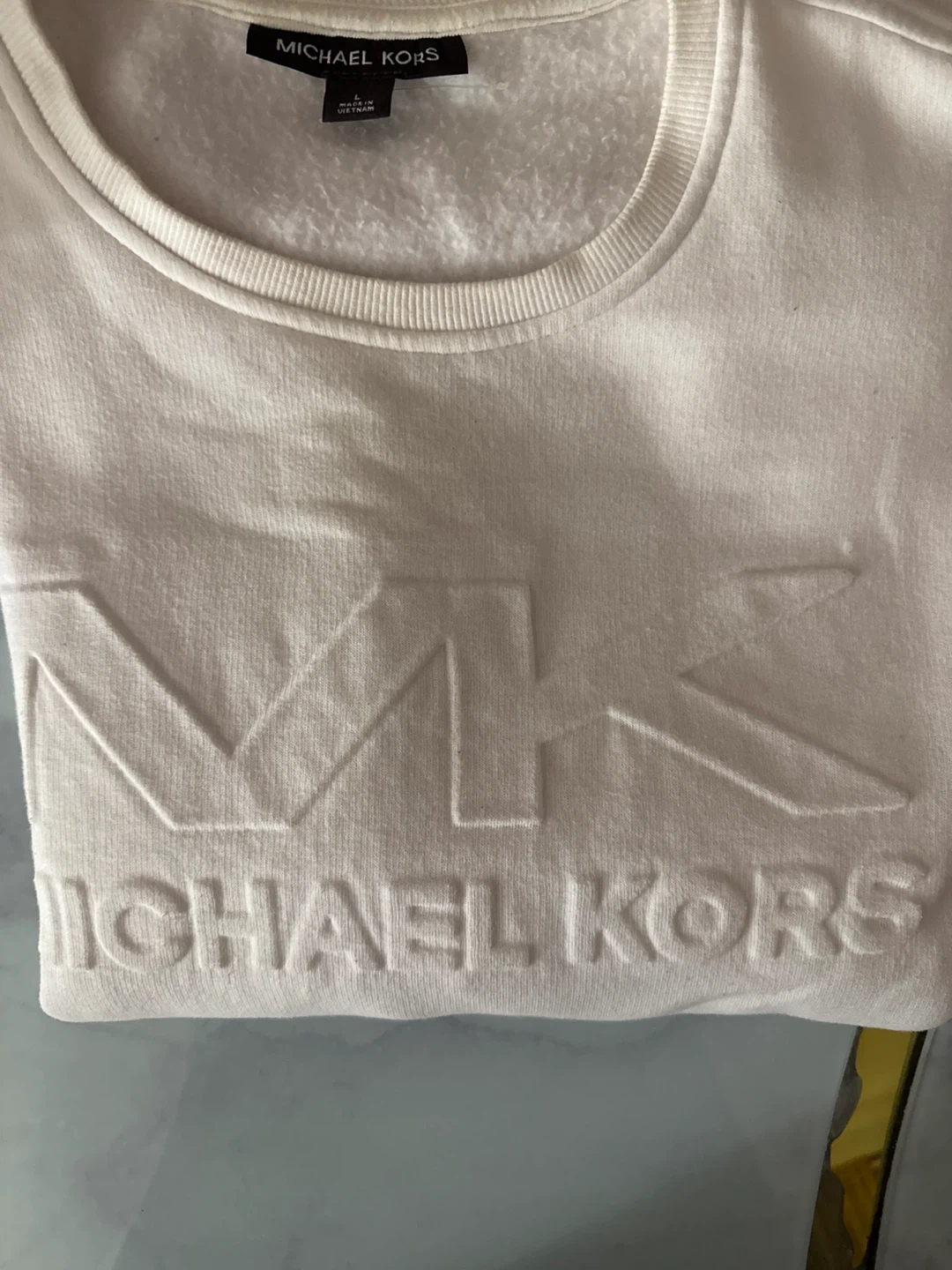 Cream Michael Kors sweatshirt. Features a raised "MK" logo on the front. Size large. Made in Vietnam.