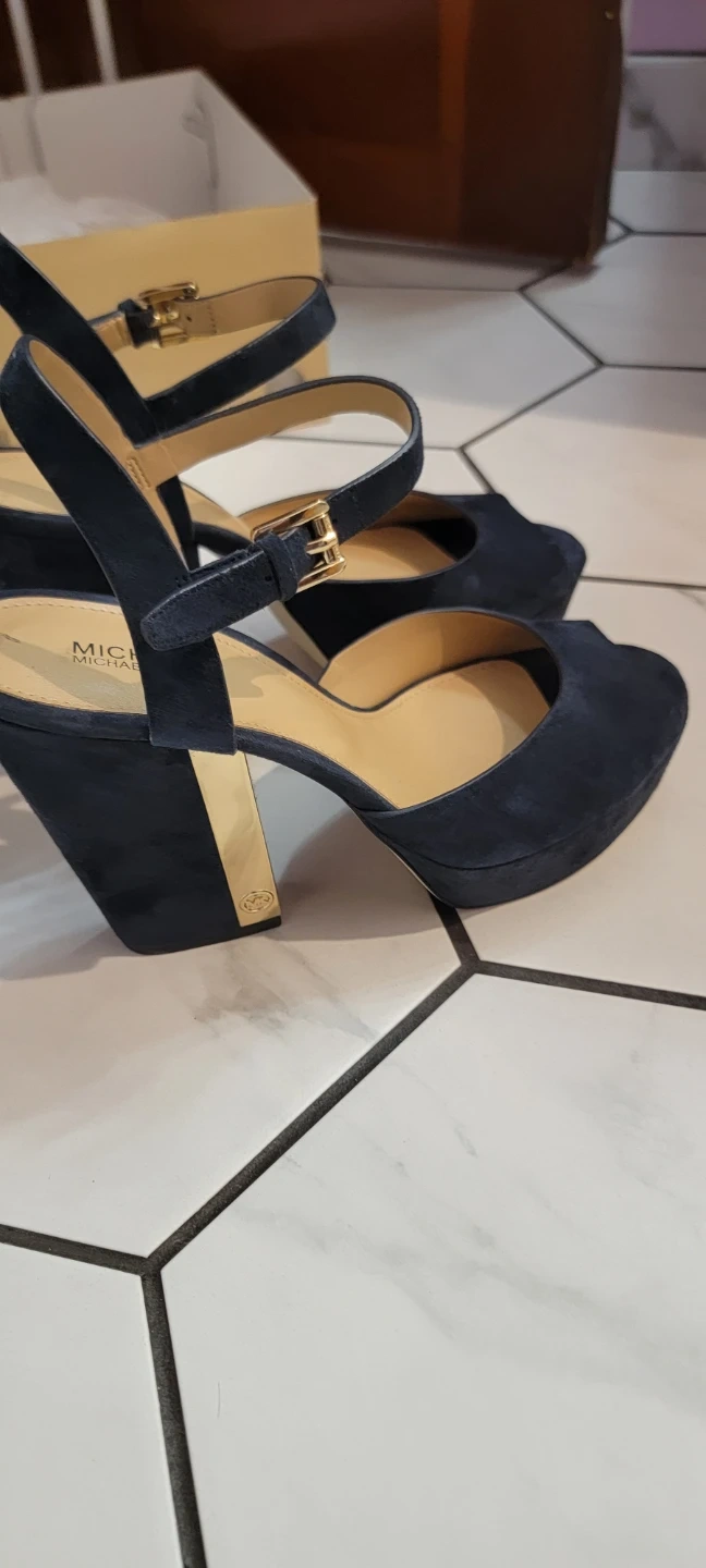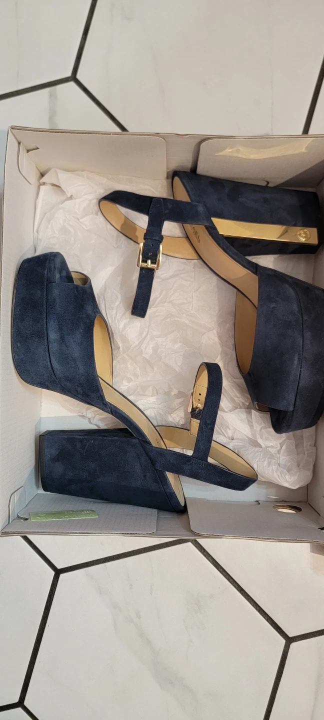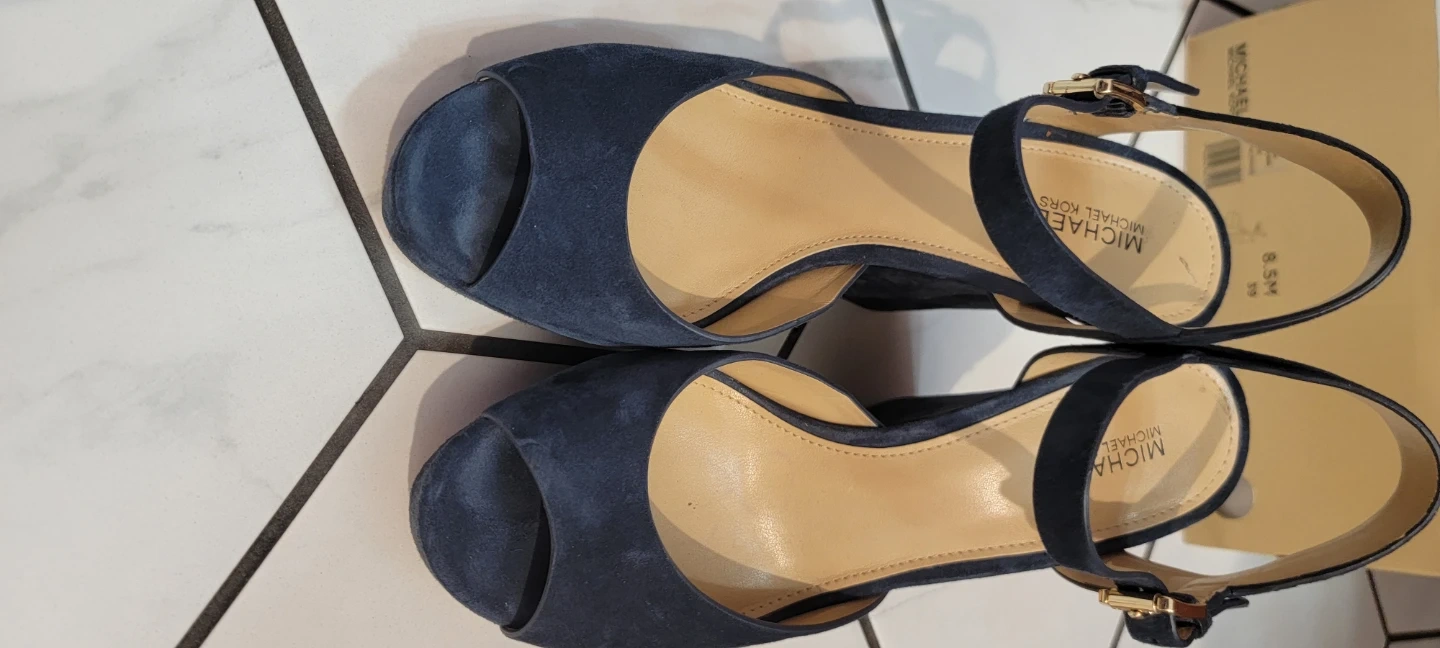 MICHAEL KORS navy blue suede platform block heels. Open toe with ankle strap closure. Includes original box. Size 8.5M. Worn for 2 hours.