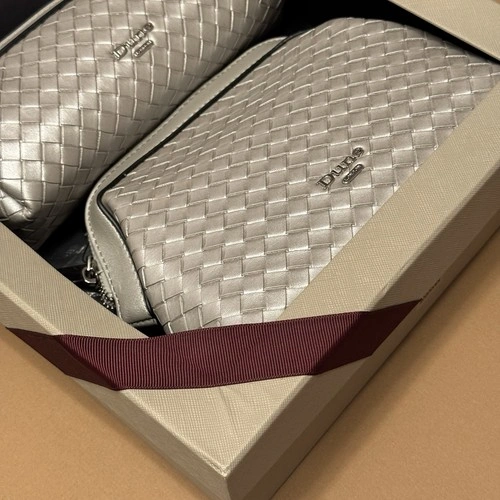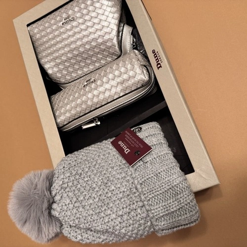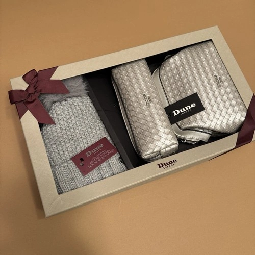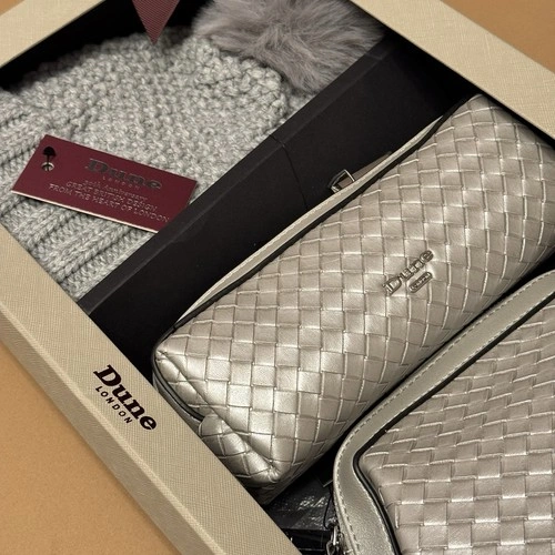 Brand-new Dune London gift set. All items are unused and come in the original box. Includes: Silver Quilted Crossbody Bag, Matching Silver Quilted Wallet / Wristlet, Gray Knit Pom Beanie (soft faux-fur pom, new with tag). Comes in original Dune London gift box. Perfect as a gift or a complete winter accessories bundle.