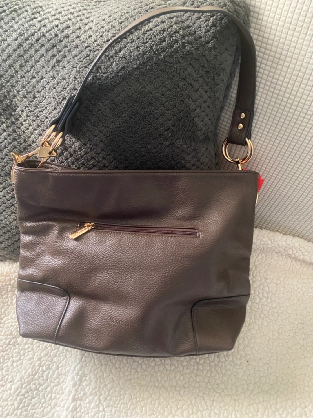 This Montana West hobo handbag is made from textured vegan leather. It features a zippered interior pocket and a zippered exterior pocket. The handbag has a single strap with gold-tone hardware.