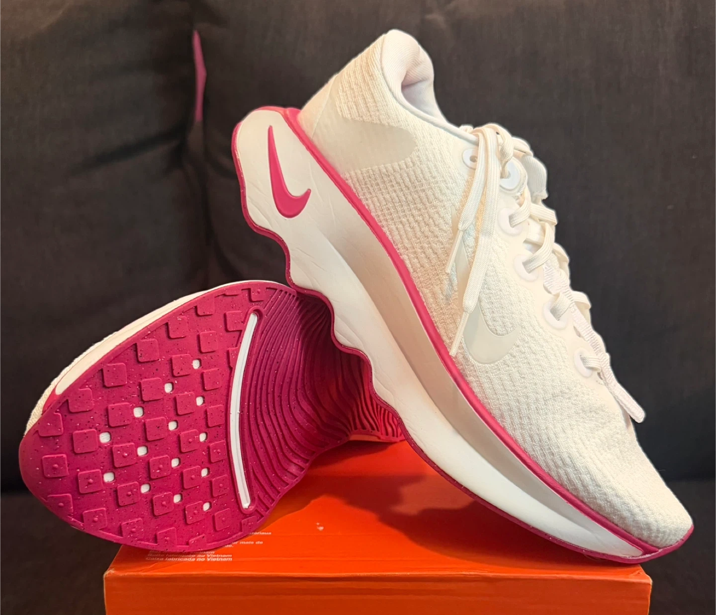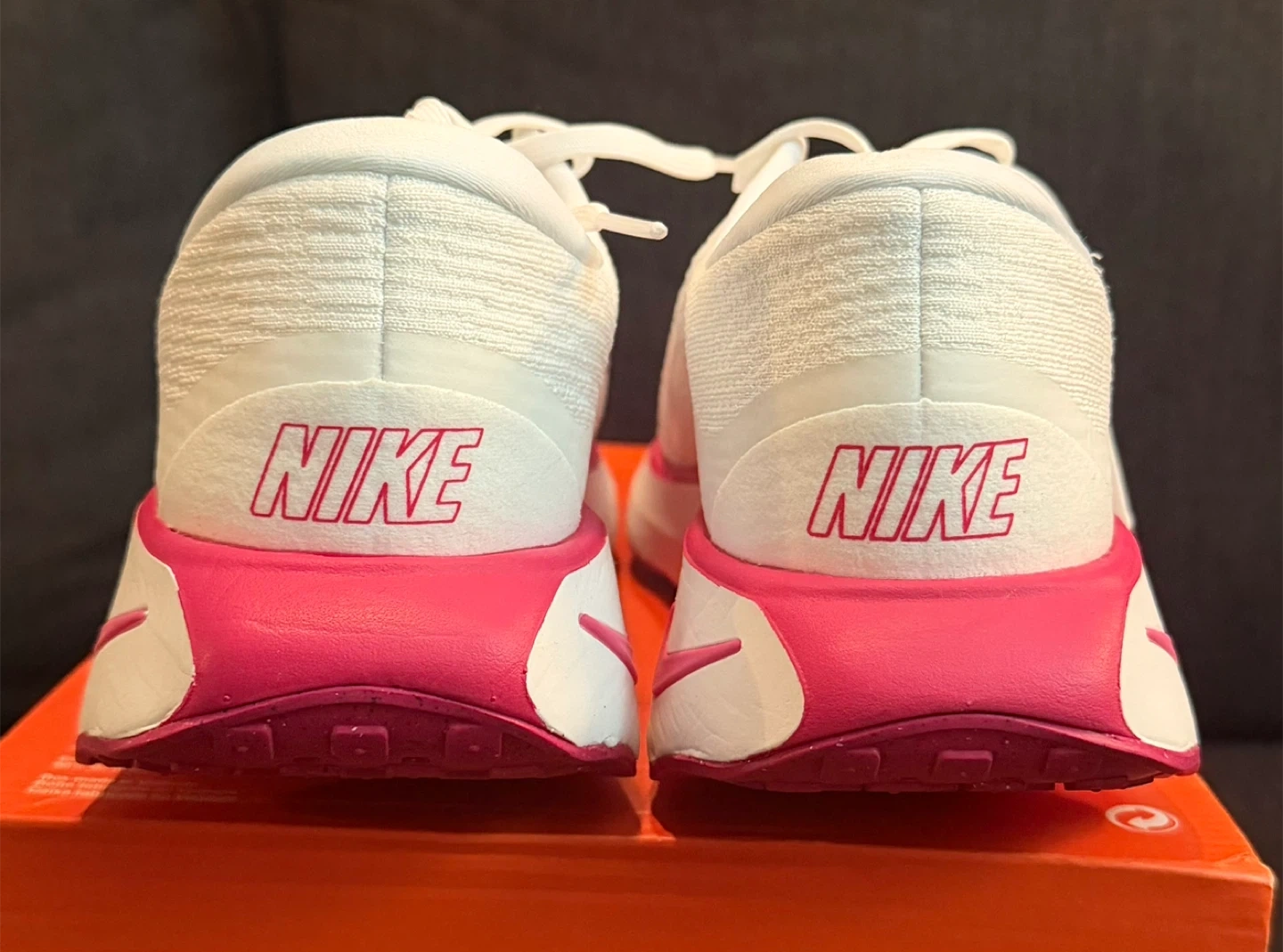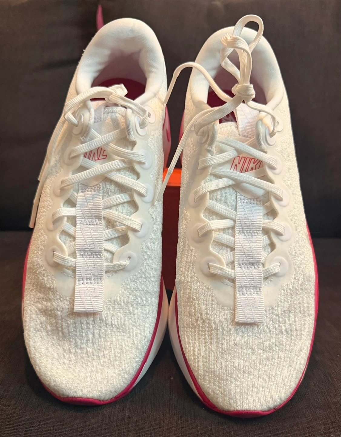 These Nike running shoes are white with bright pink accents. They feature a breathable knit upper and a cushioned sole for comfort. Great for athletic activities or casual wear!