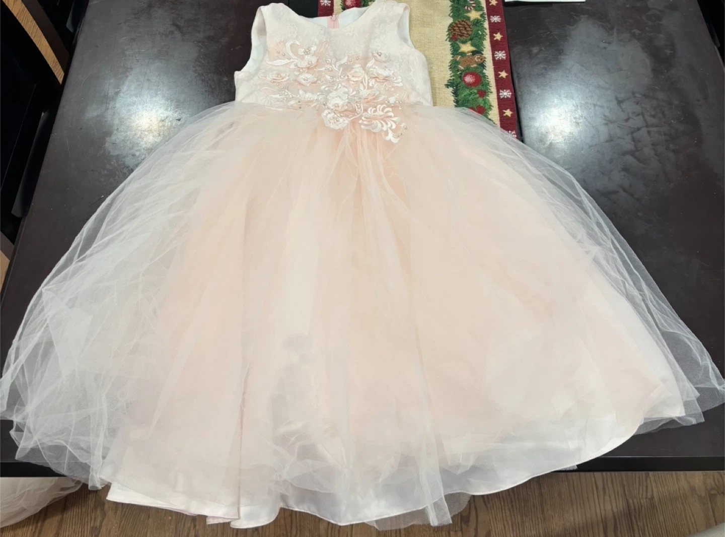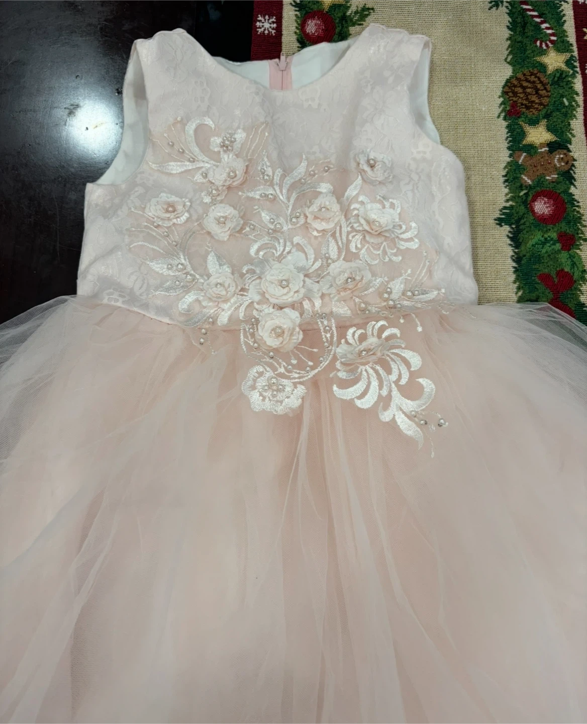 This is a beautiful pink tulle dress by Joykids. It's a size 6 and features delicate floral embroidery on the bodice. Perfect for special occasions!