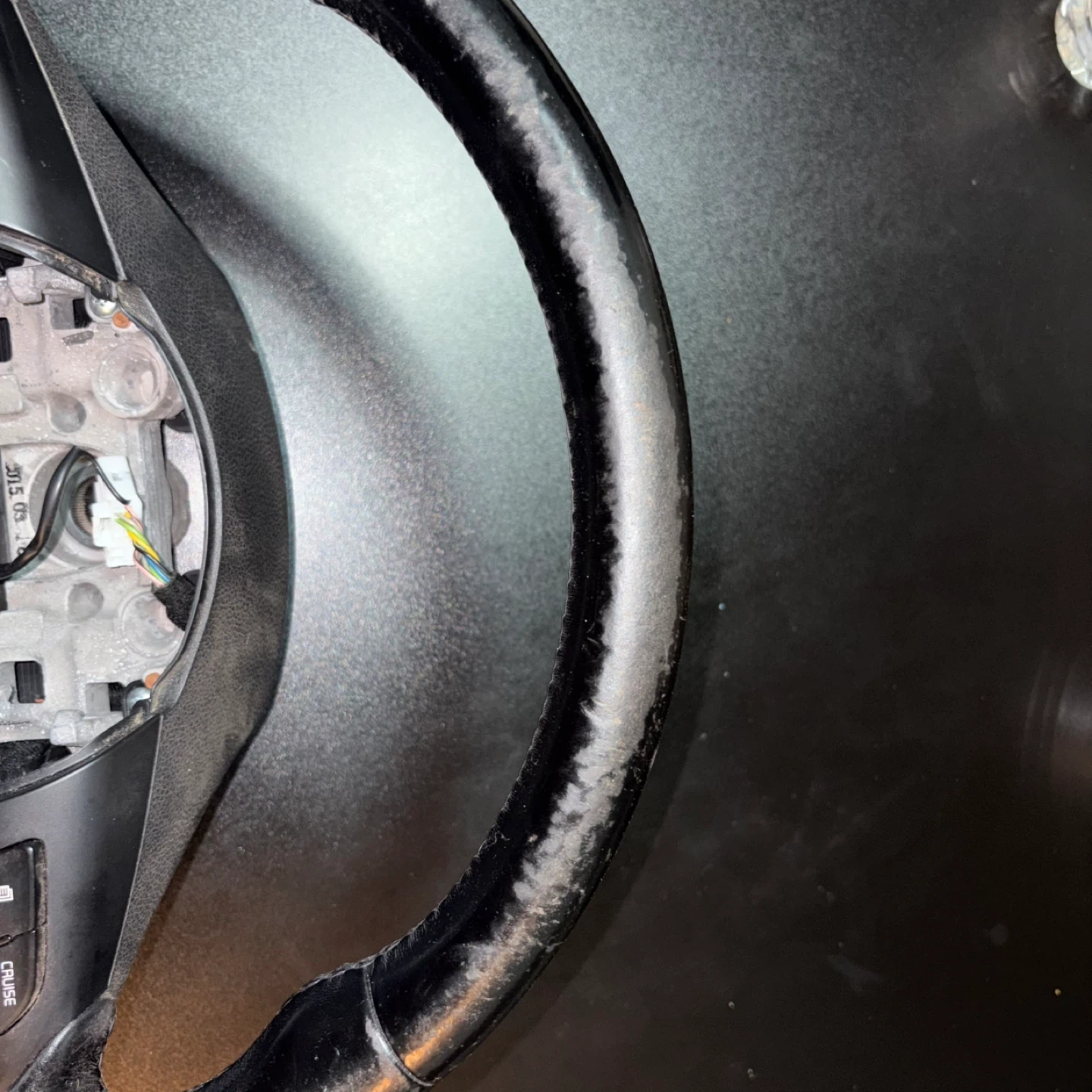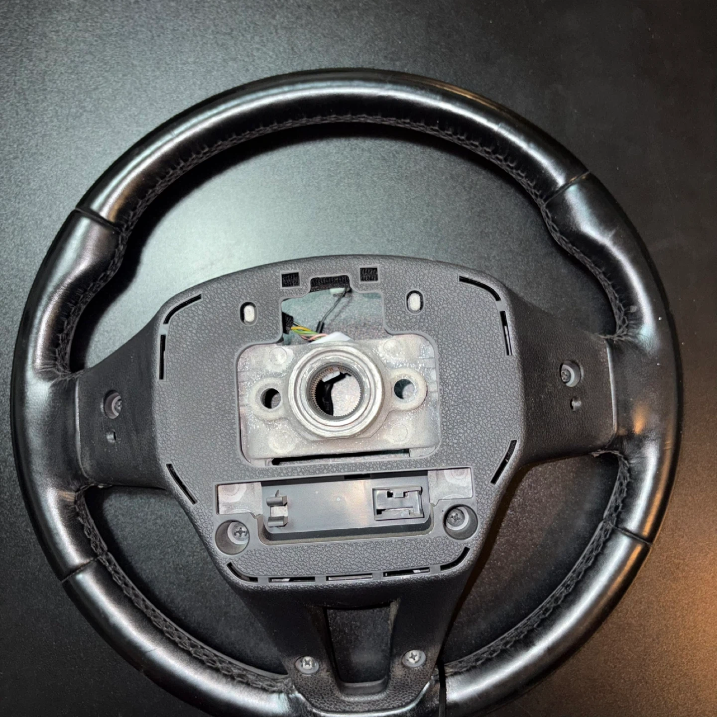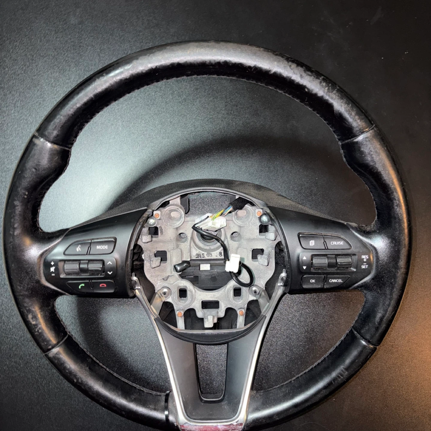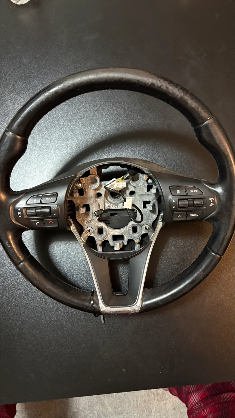 Selling a used car steering wheel. It shows signs of wear and use, as seen in the pictures. Please take a close look at the photos to assess the condition before reaching out!