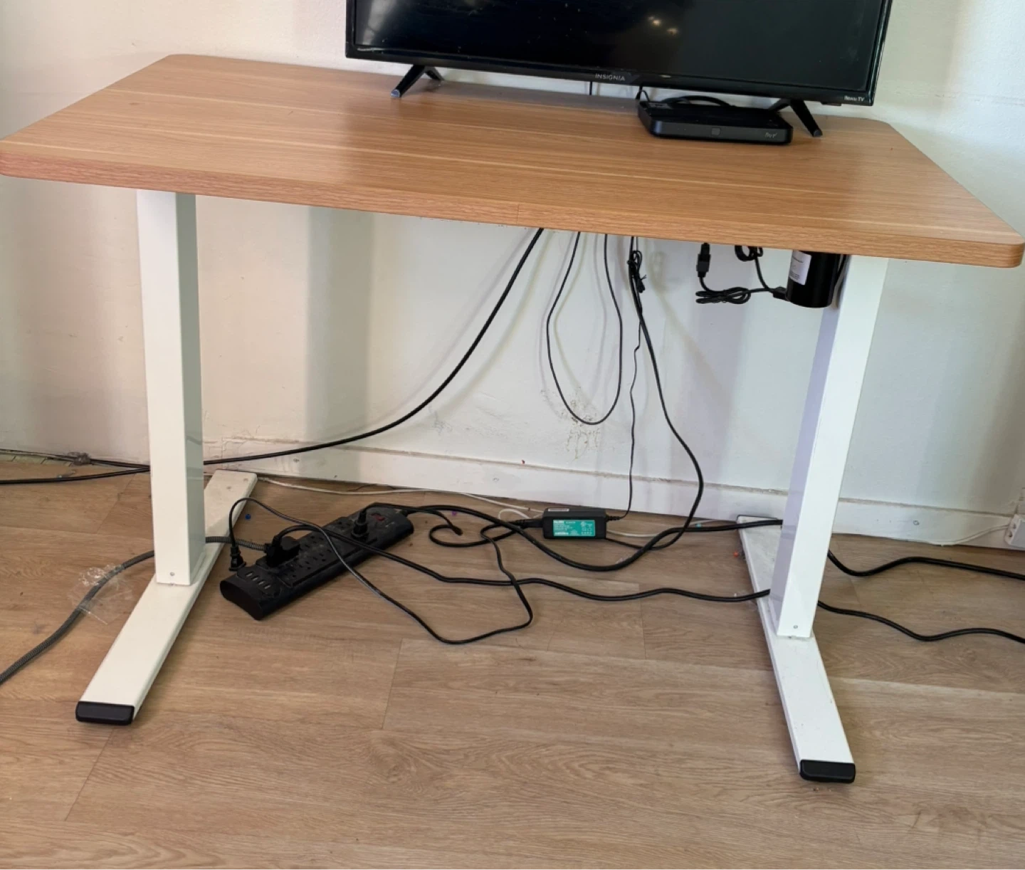 Adjustable height standing desk with a natural wood top and white metal legs. It's a great option for a home office setup. The desk features a motorized lift system.