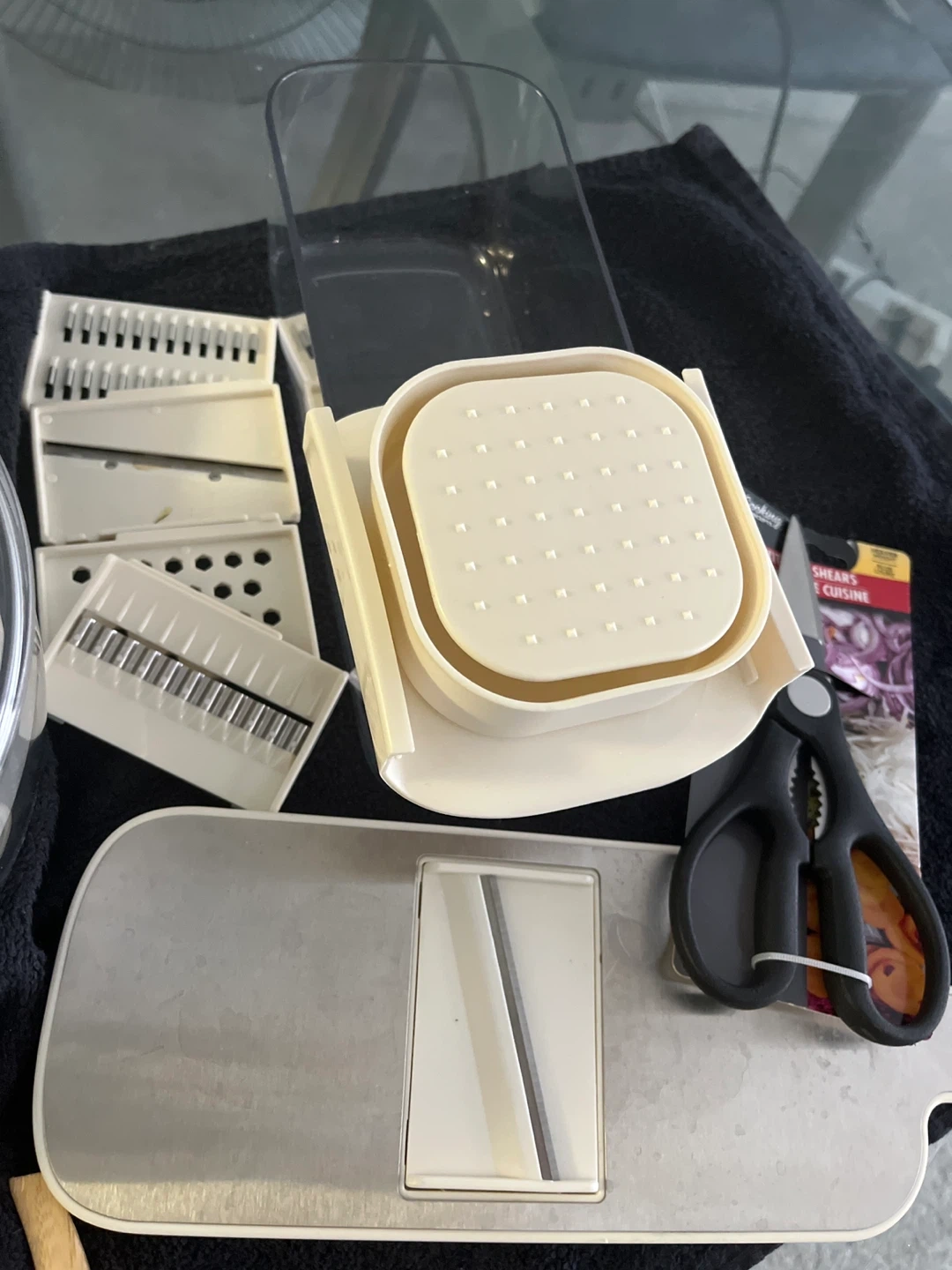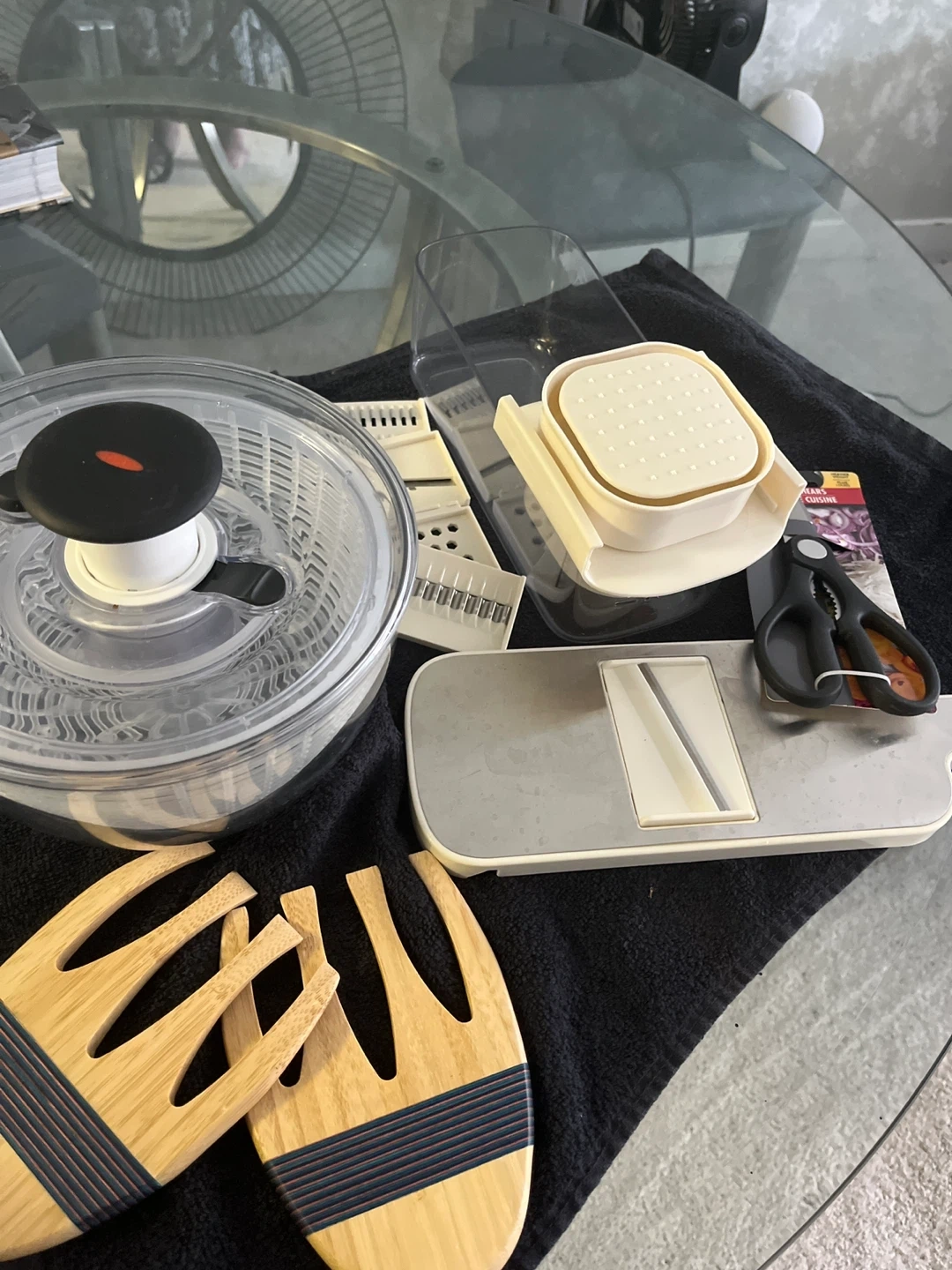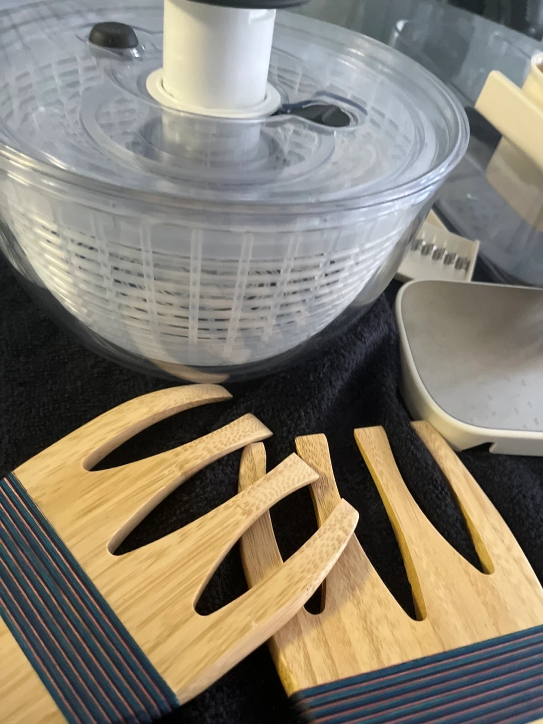 This OXO set includes a salad spinner for drying greens and a vegetable chopper with multiple blade attachments. Also comes with bamboo salad tongs and kitchen shears. Spinner has a non-slip base and a clear bowl.